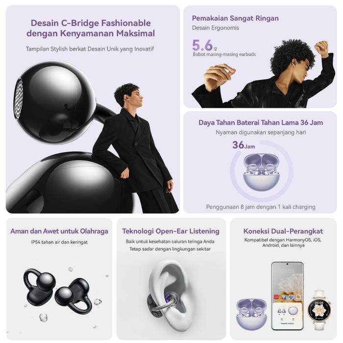 HUAWEI FreeClip 2 Open-Ear TWS Earphone C-Bridge Design Black Garansi Resmi Bluetooth 5.2 IP54 Tahan Debu Air 31 Jam