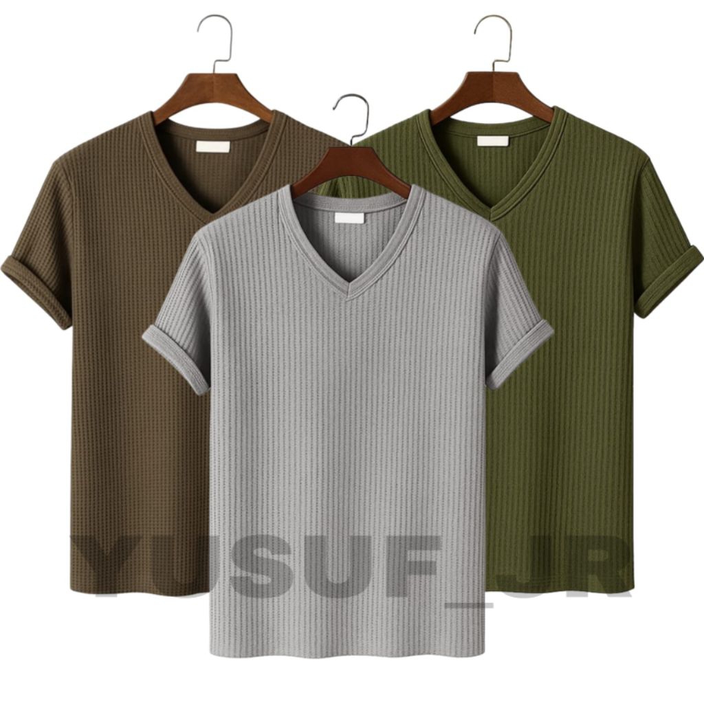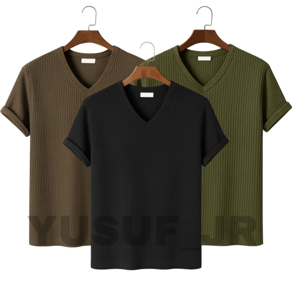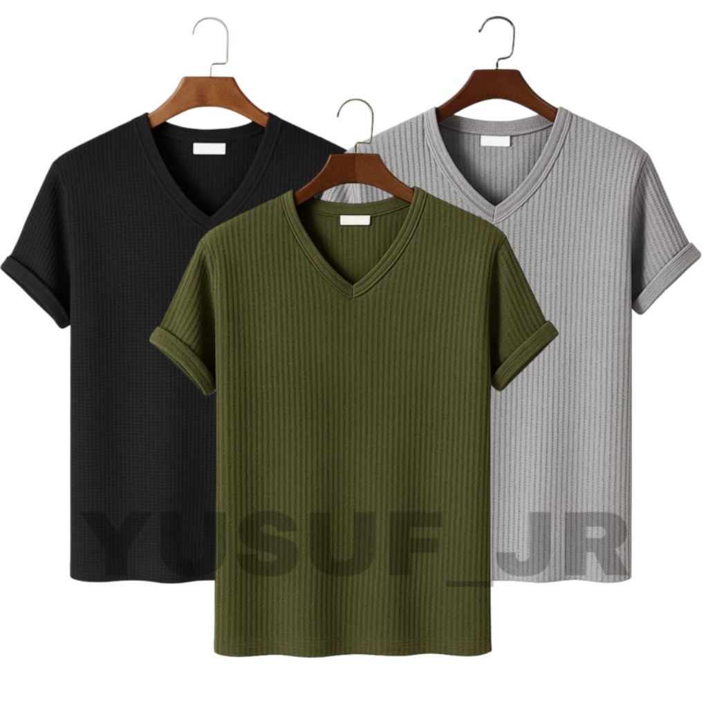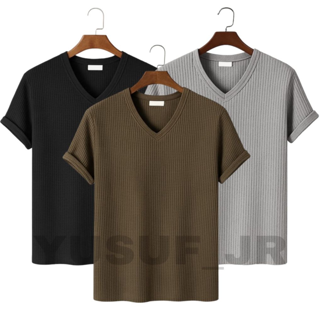 FLASH SALE Baju Atasan Priawanita lengan pendek bahan waffle knit berkerah VNeck