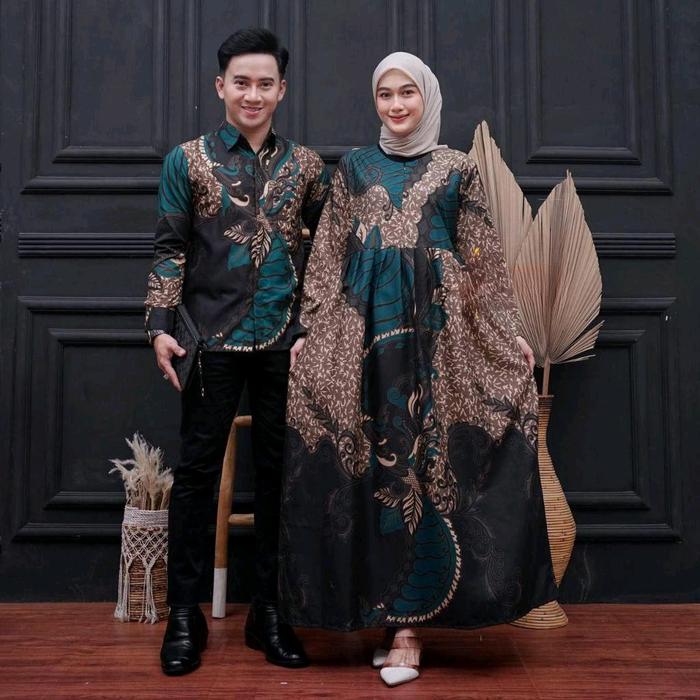 Baju Couple Batik Kemeja Pria Lengan Panjang Dan Gamis Wanita Syari Muslimah Pasangan Sarimbit Dress Kondangan Pesta - S