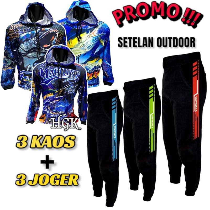 PROMO Paket 3+3 Setelan Jersey Mancing + Celana Panjang Joger / Jersey Mancing Full Printing / Kaos Basahan Outdoor Kupluk Dewasa / Setelan Kaos Jersey Pancing Bertudung