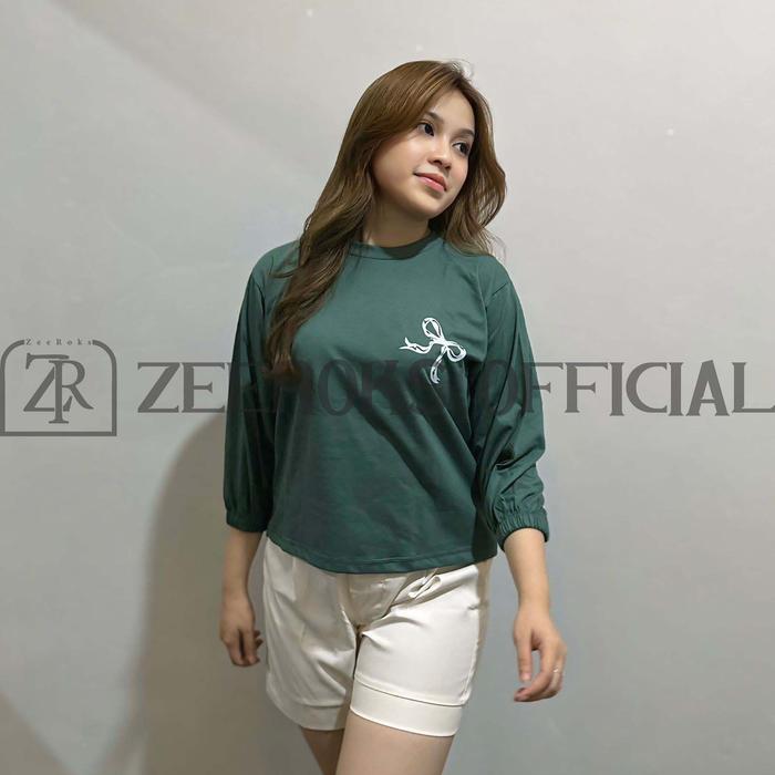 Zeeroks Baju Wanita Lengan Balon Sablon Pita Kaos Cewek Bahan Cotton Combed Katun - Milo, M