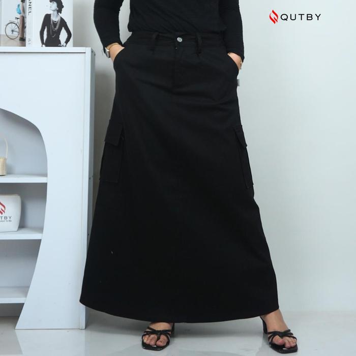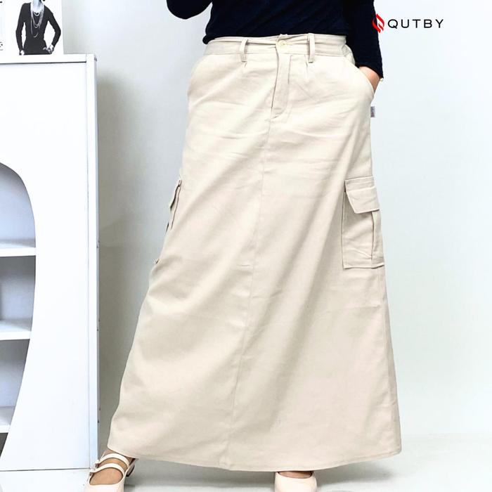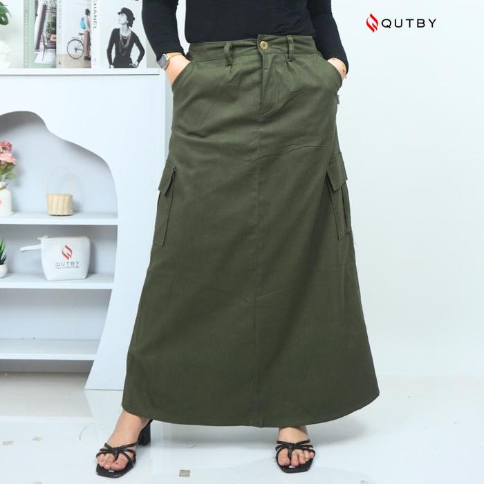Qutby - Rok Panjang Wanita A Line Bahan Katun Adem Pinggang Karet Kancing Melar Muat Bb 45-125Kg Ootd Kekinian - Army, S