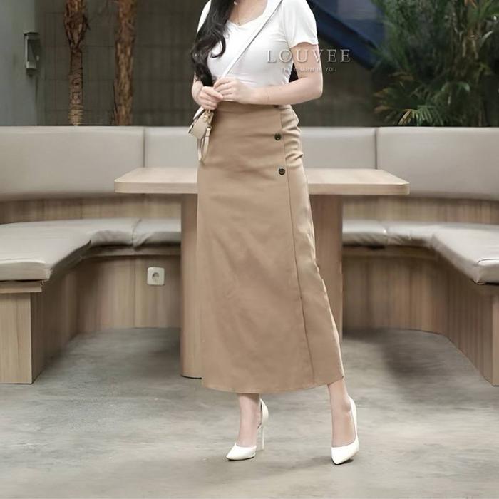 Louvee - Luna Skirt - Rok Panjang Bengalin Wanita - Semi A-Line Karet Standar Basic Earth Tone Basic Skirt - Cofee, Stan