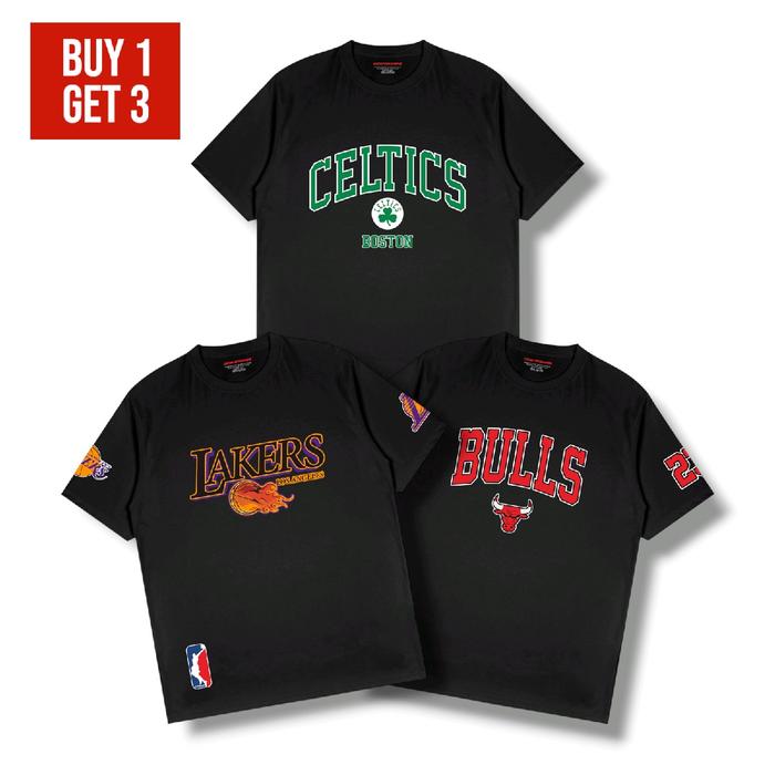 [Buy 1 Get 3] Kaos Distro Pria Motif Bulls - Celtics - Lakers Keren Katun Combed 24S Tshirt Baju Dewasa Hitam - S