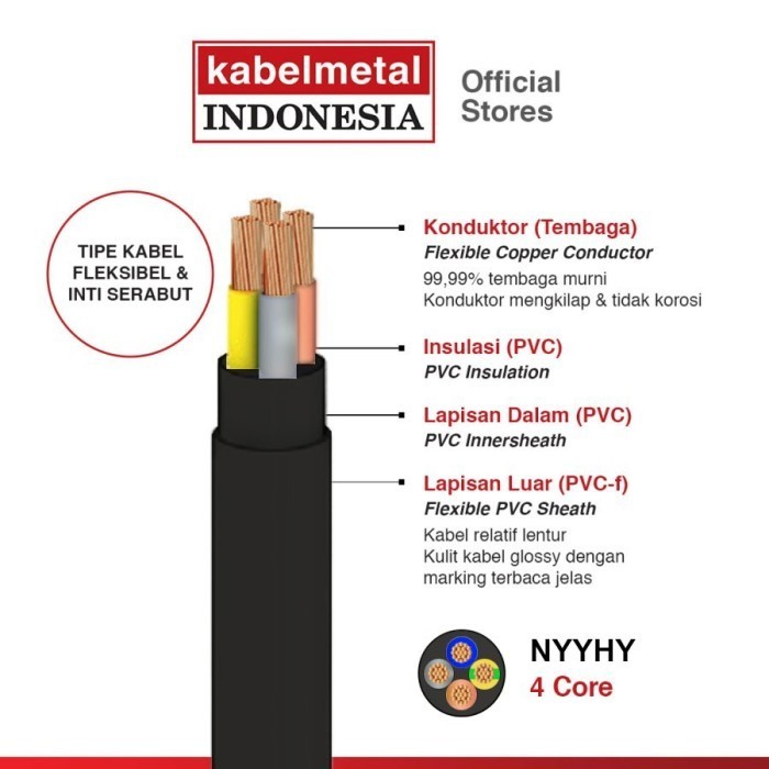 Kabel NYY Flexible NYYHY 4x10 mm Per Meter kabelmetal Serabut Tembaga Fleksibel PVC Hitam Listrik KMI SNI
