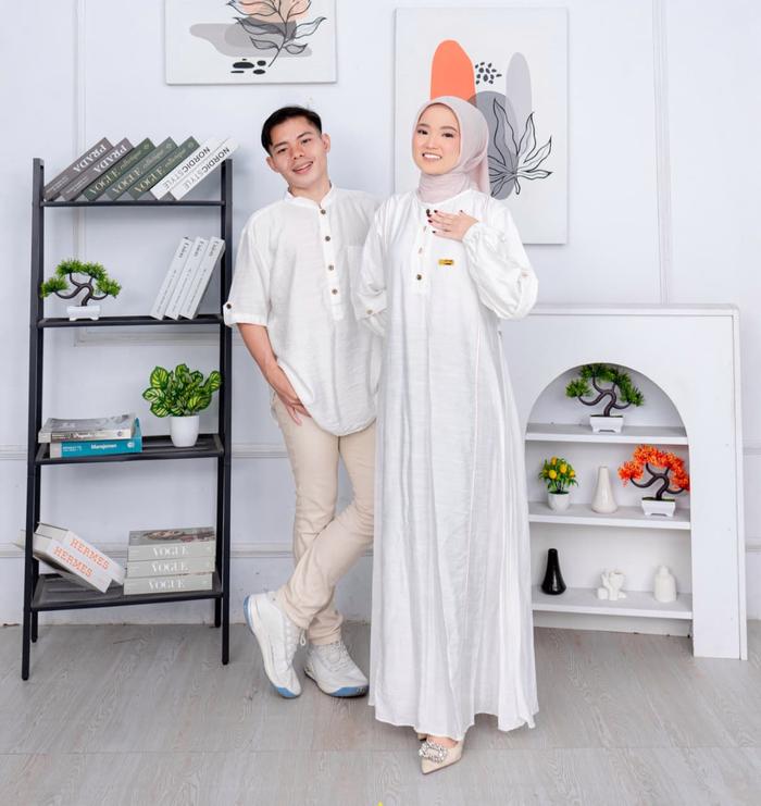 Rizkia Dress Baju Gamis Terbaru Elegan Mewah Baju Lebaran 2026 Couple Sarimbit Koko Bahan Polo Linen - Gamis Bw, L