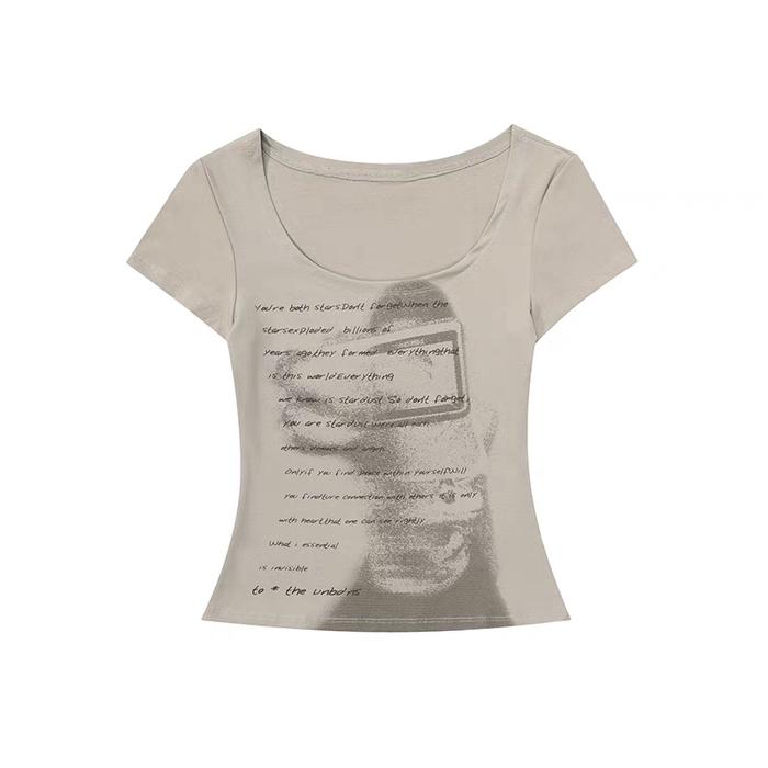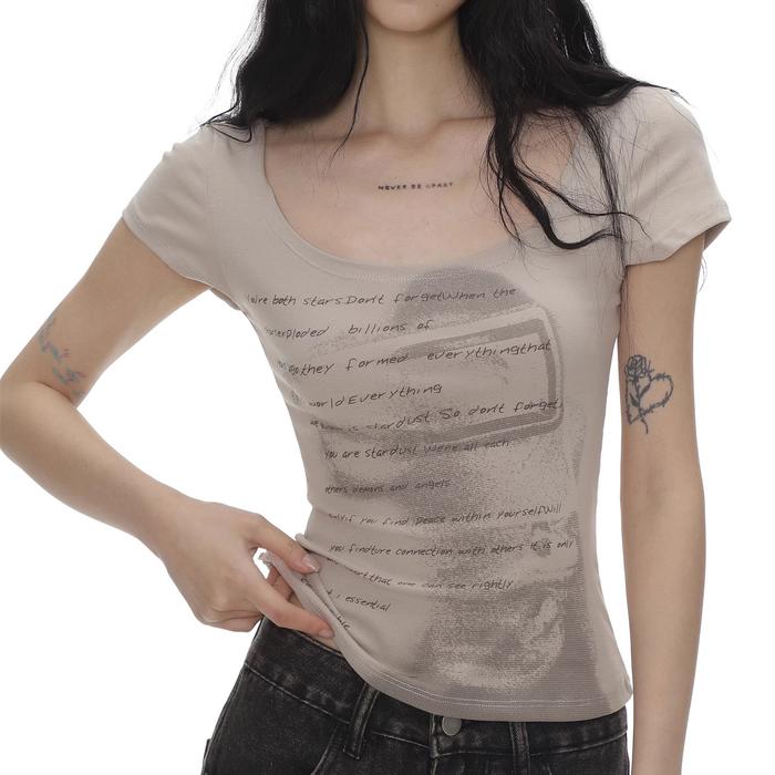 【Arcg】Khaki Kaos Pendek Wanita Slim Fit Membuat Langsing Leher U Besar Huruf Alfabet/Baju Atas Wanita Lengan Pendek Berg