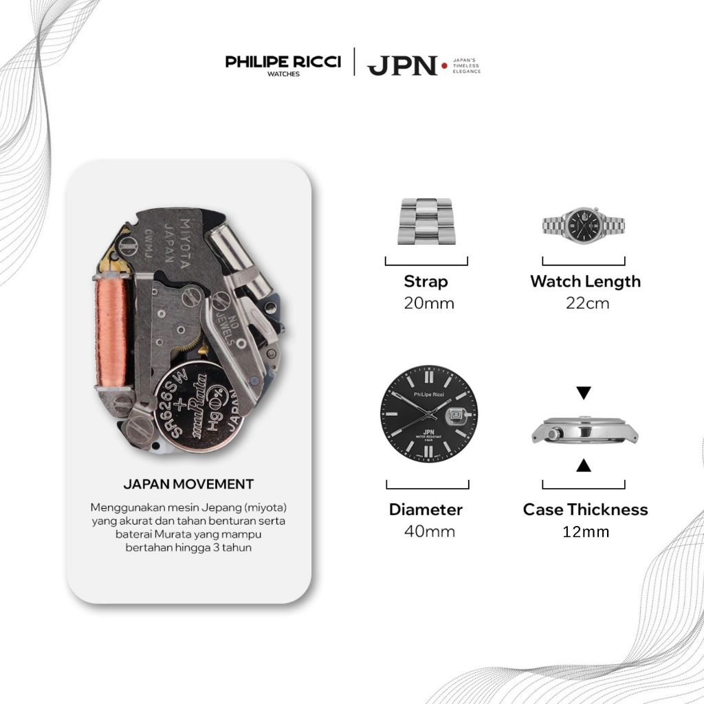 PhiLipe Ricci JPN Jam Tangan Pria Anti Air Ori Rantai Stainless Steel Terbaru 5092 Cowok Free Box