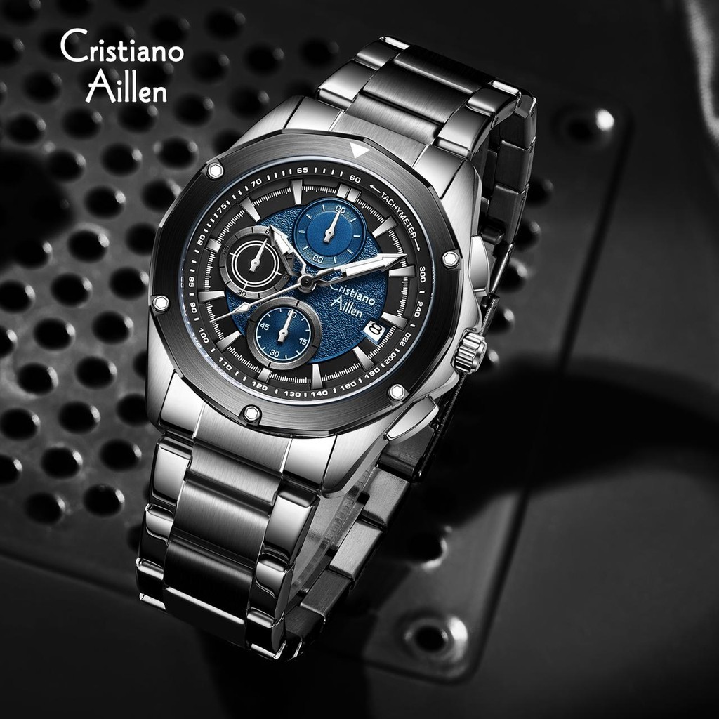 Buy 1 Get 1 Jam Tangan Cristiano Aillen Jam Tangan Pria Analog 8899 Rantai Stainless Steel Chronograph Kaca Sapphire Water Resistant 3 ATM