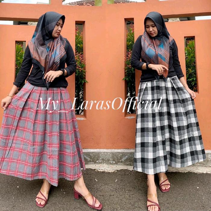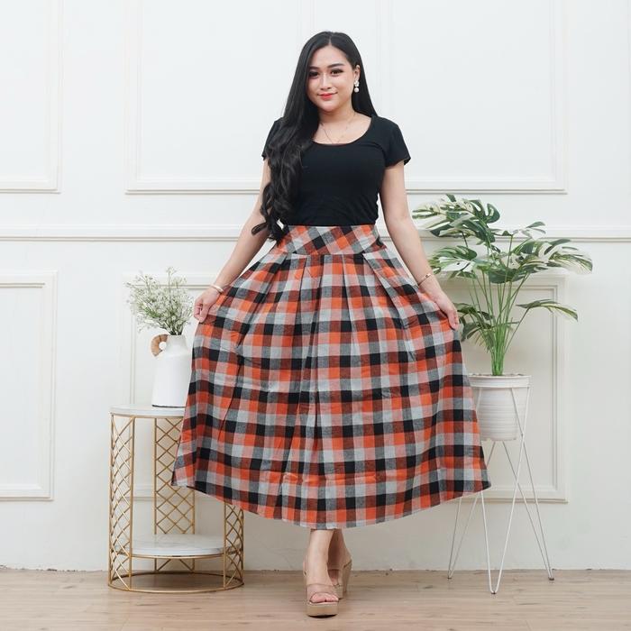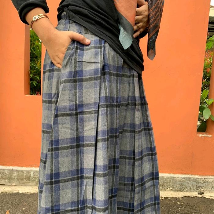 Rok Saja Midi 7/9 Flanel Kotak - Wanita Dewasa Casual Rempel - Navy Biru, All Size