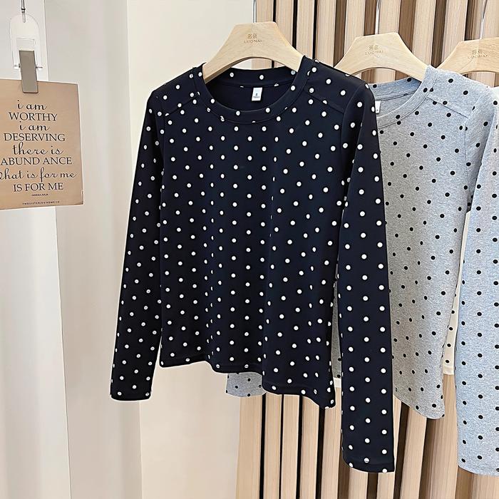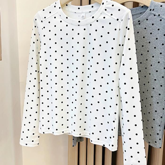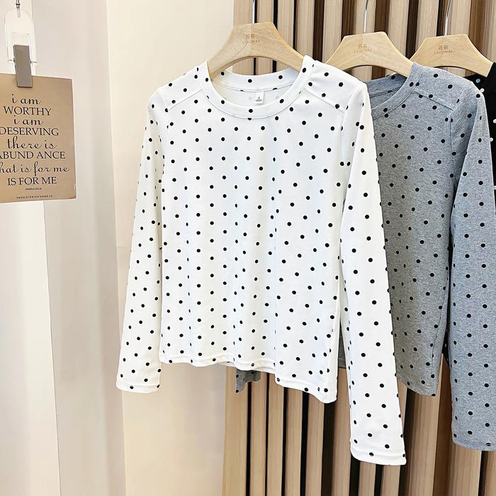 Kaos Oblong Lengan Panjang Motif Polkadot Abu-Abu Dengan Bahan Stretch Tinggi - Putih, S