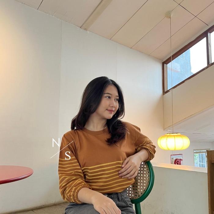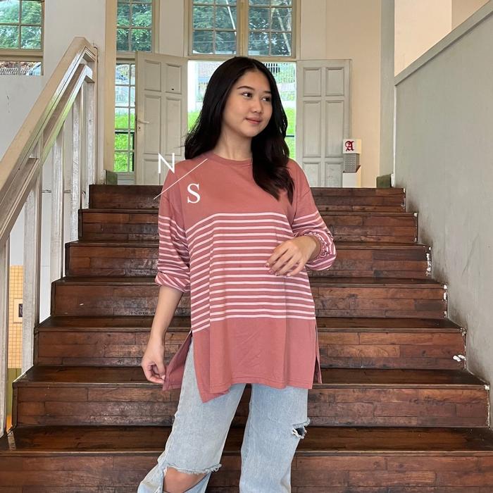 Kaos Blouse Atasan Wanita Salur Katun Combed 24S Lengan Balon With Highslit - Jetblack+Lightgrey, M