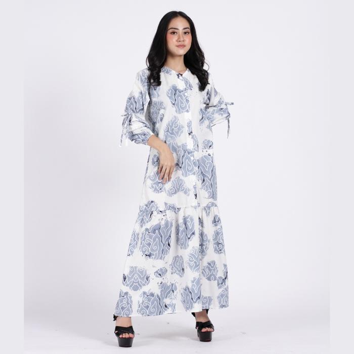 Batik Trusmi Set Couple Dress Dan Kemeja Batik Motif Mega Mendung Bumi Pita Biru Katun Baju Pasangan Sarimbit Keluarga K