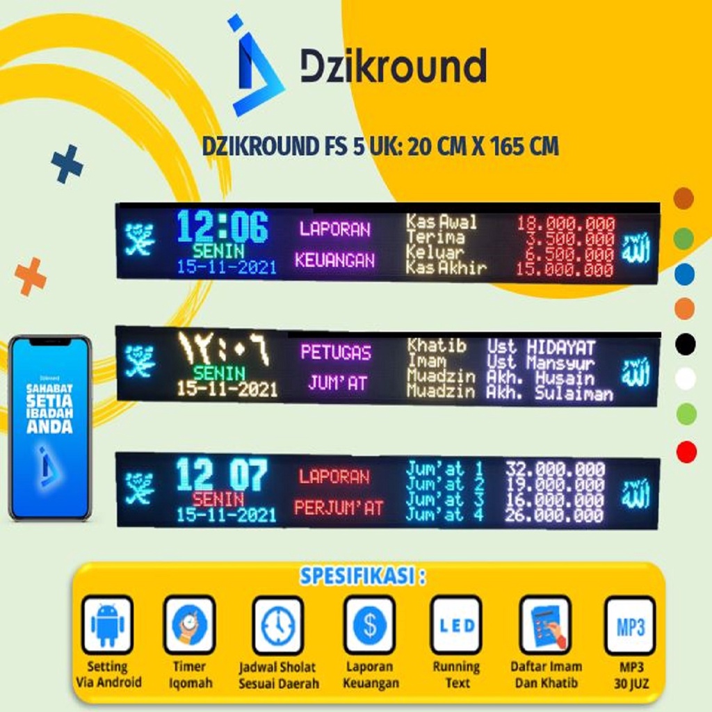 DZIKROUND FS5 Jam digital jadwal sholat masjid running texT timer iqomah Fullcolour 20x165