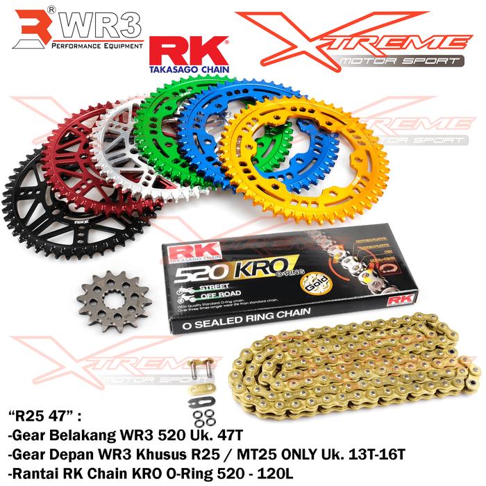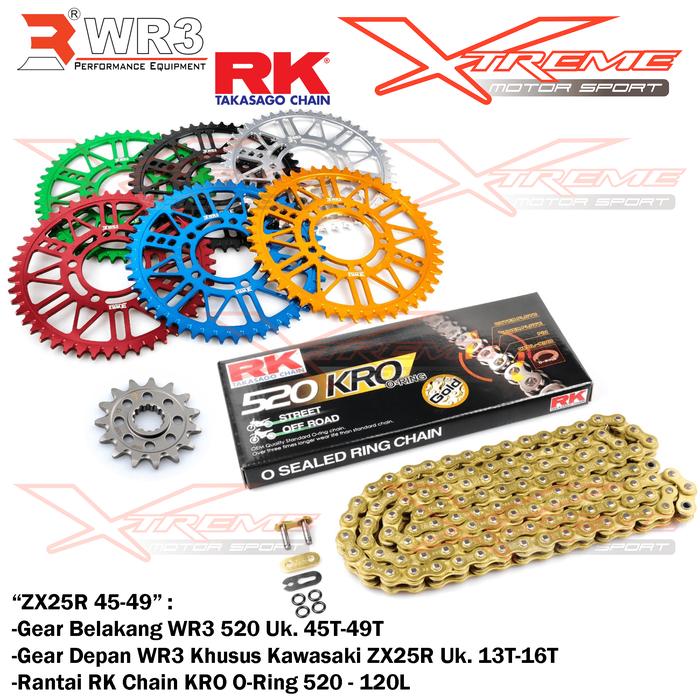 GEAR SET DEPAN BELAKANG WR3 & RANTAI RK CHAIN ZX25R NINJA CBR 250 GSX 150 150RR RR R25 MT25 R15 MT15 ER6 RX KING