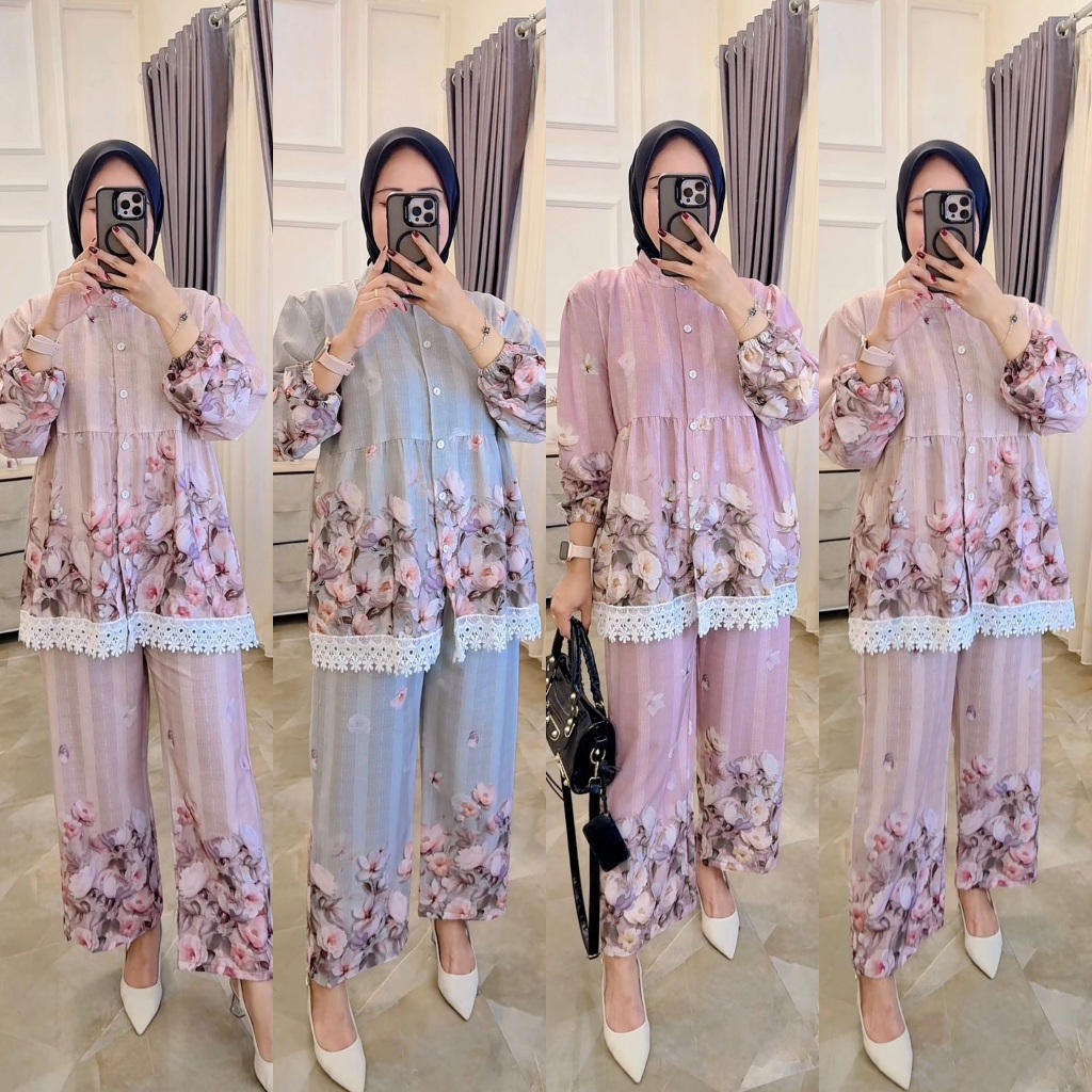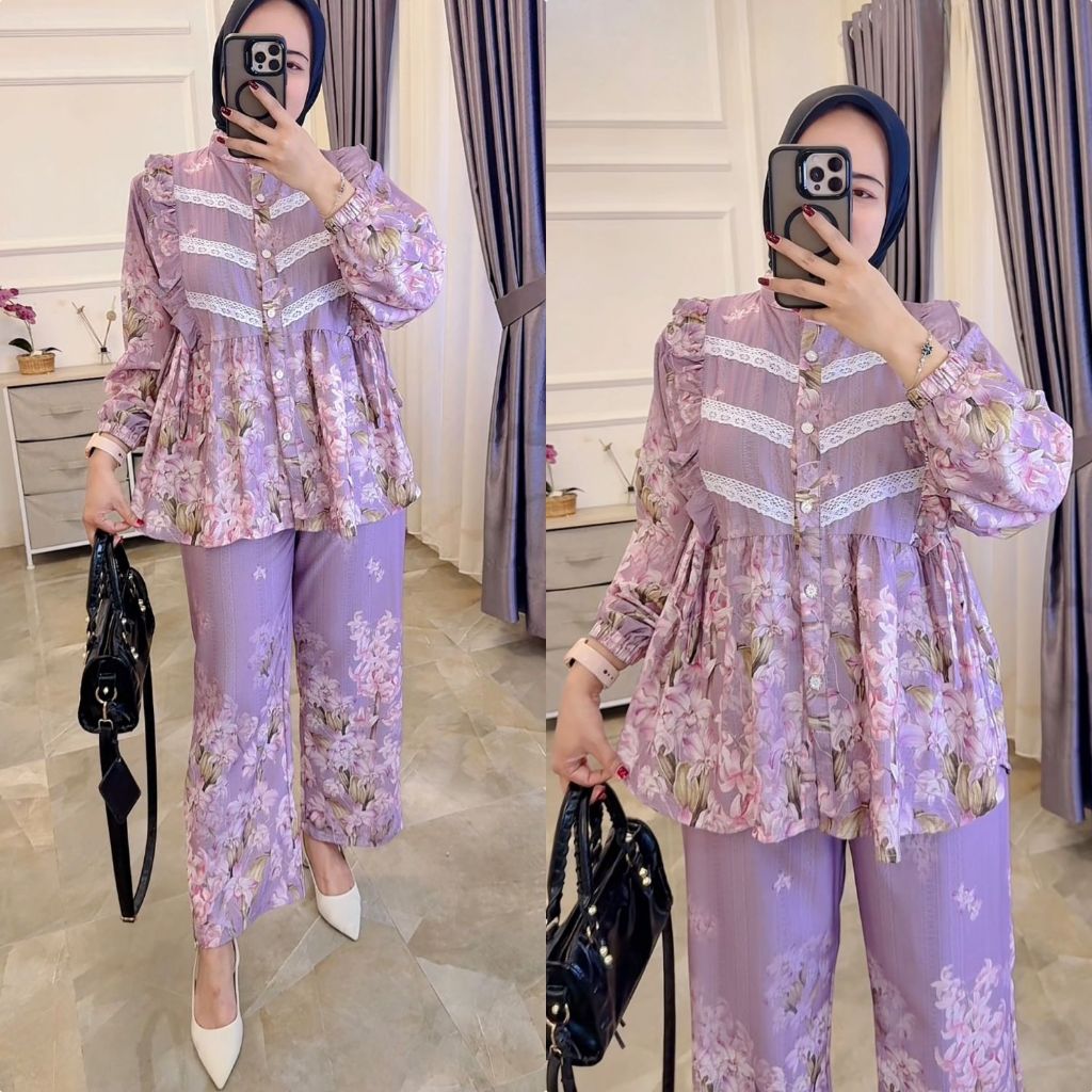 LAVESHA B One Set Setelan Celana aplikasi renda 2in1 Atasan Blouse Wanita Coquette Aesthetic Casual Korean Style Pastel