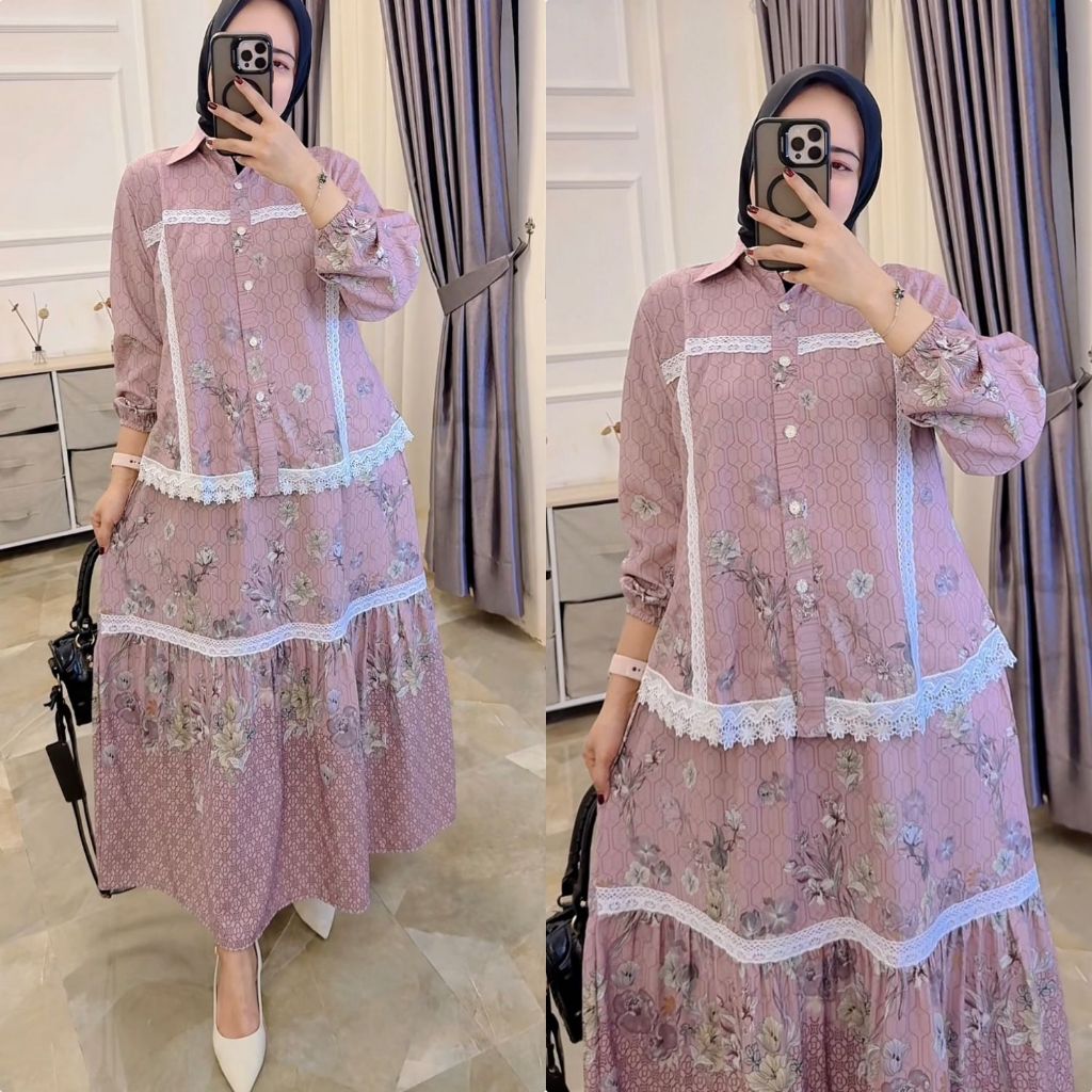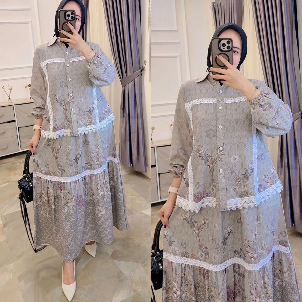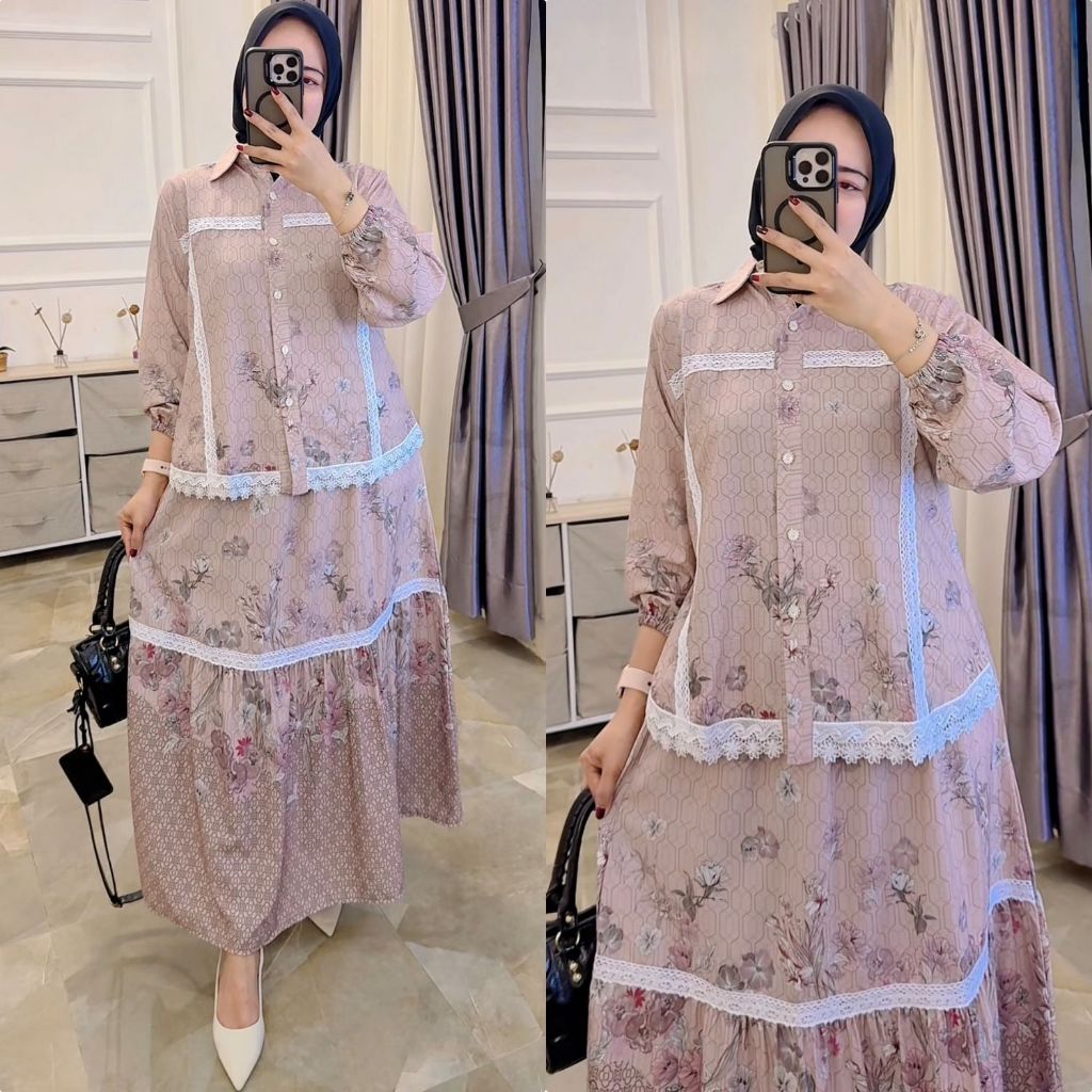 VANIA Coconici C One Set Setelan Rok Tingkat Ruffle Atasan Blouse Wanita Coquette Aesthetic Casual Korean Style Pastel Renda Lace Floral