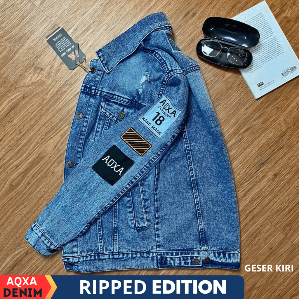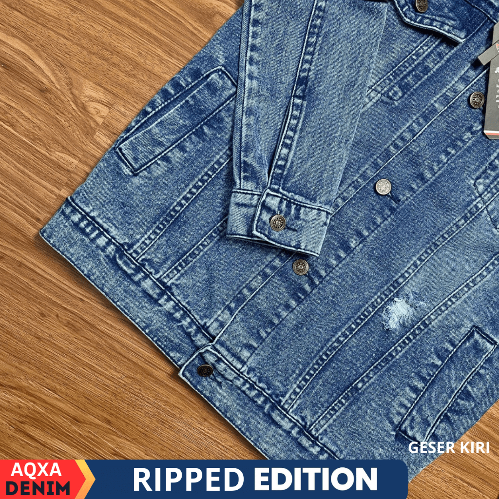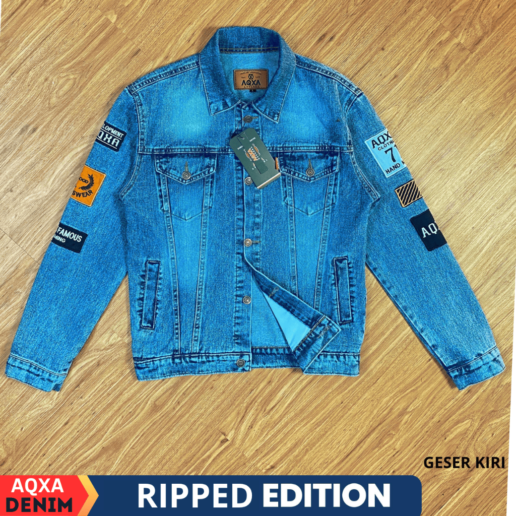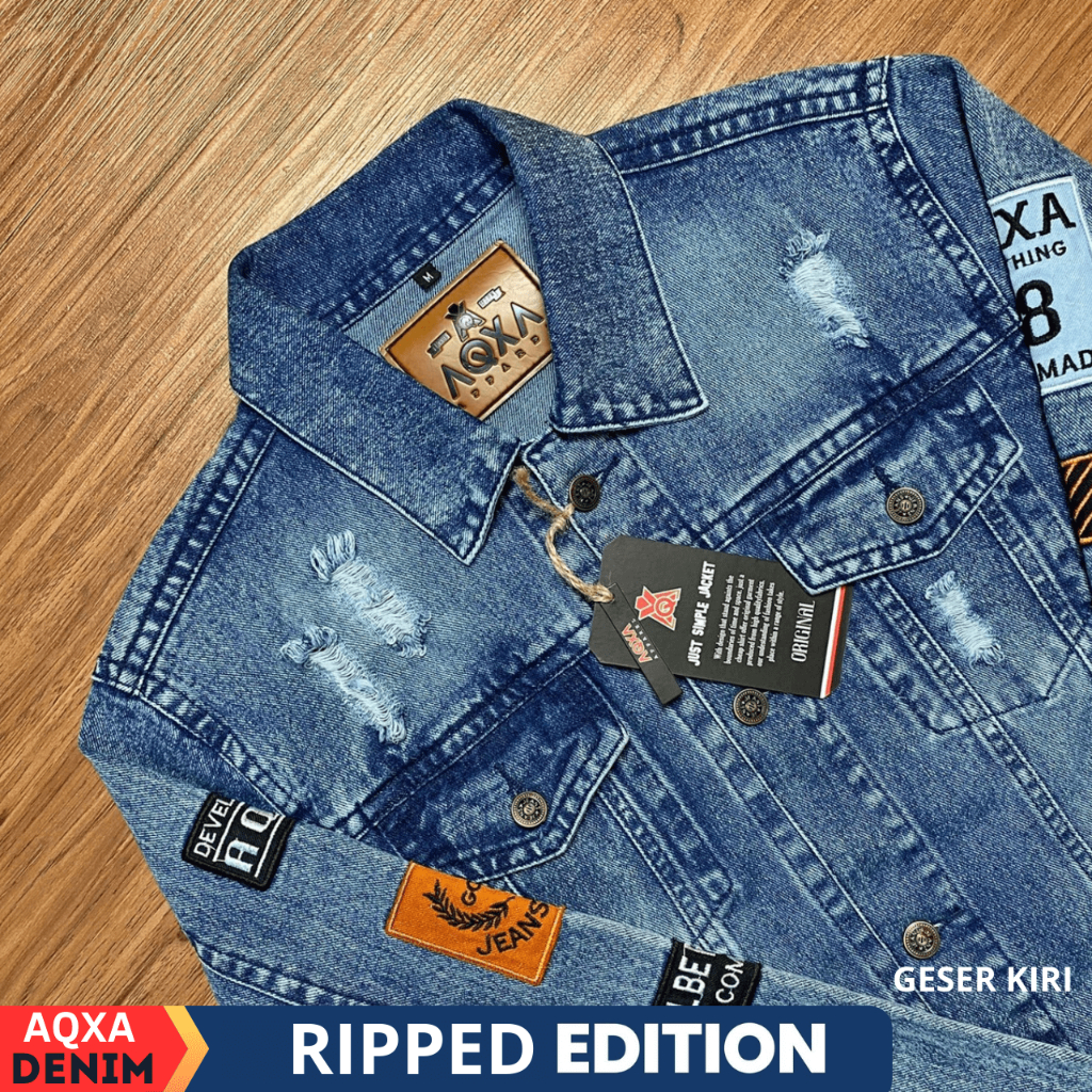 AQXA Jaket Denim Jeans Pria Motif Sobek Bordir Slimfit Murah Keren Tebal Buat Nongkrong