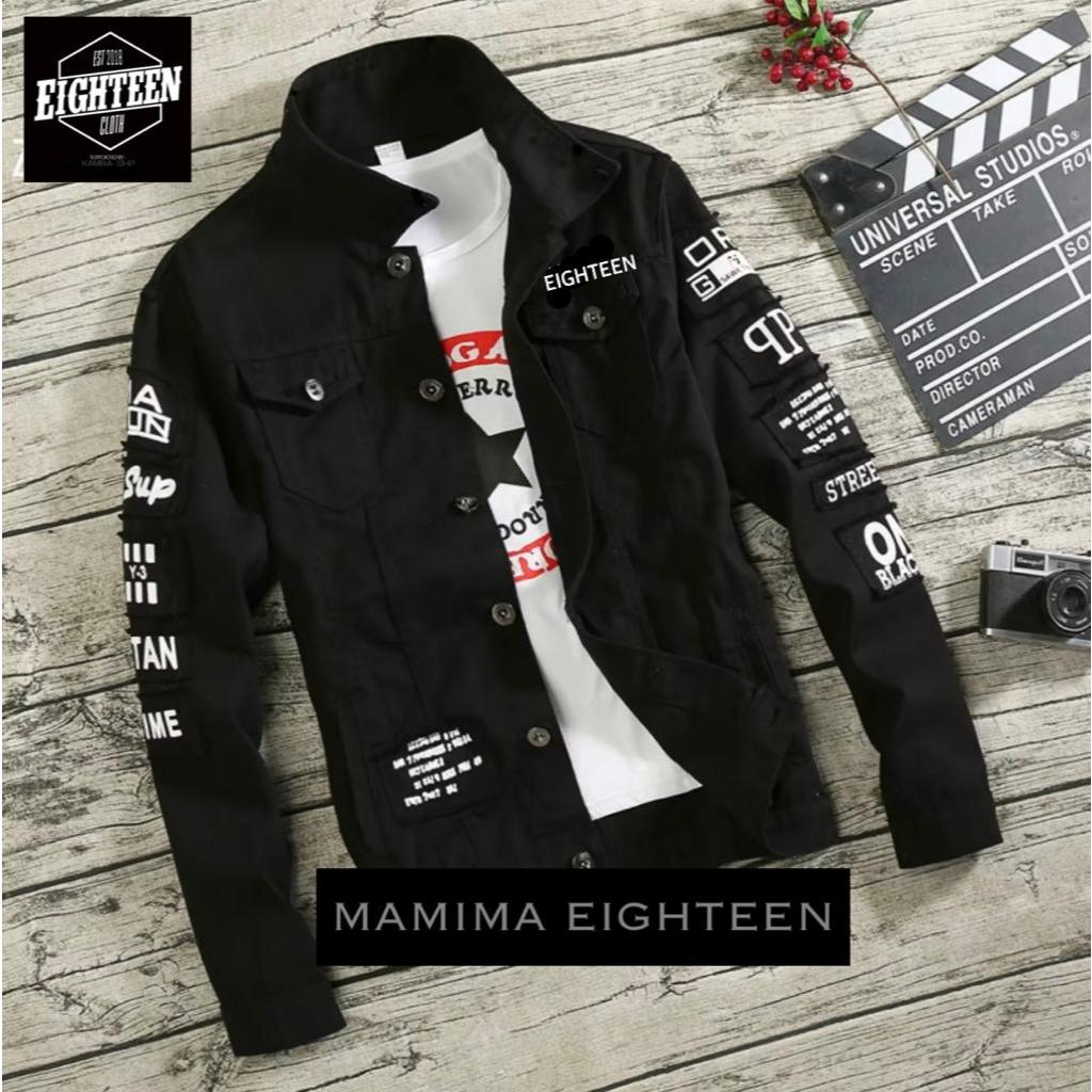 JAKET JEANS PRIA EL TERBARU JEANS SOBEK TEMPEL EMBLEM JAKET JEANS COWOK CEWEK BANDUNG MURAH DISTRO