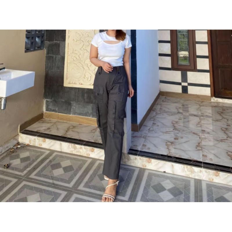 Olivia - Celana Culotte Cargo Strech Katun Twill / Kulot Cargo Wanita Highwaist Kekenian Dengan 4 Saku