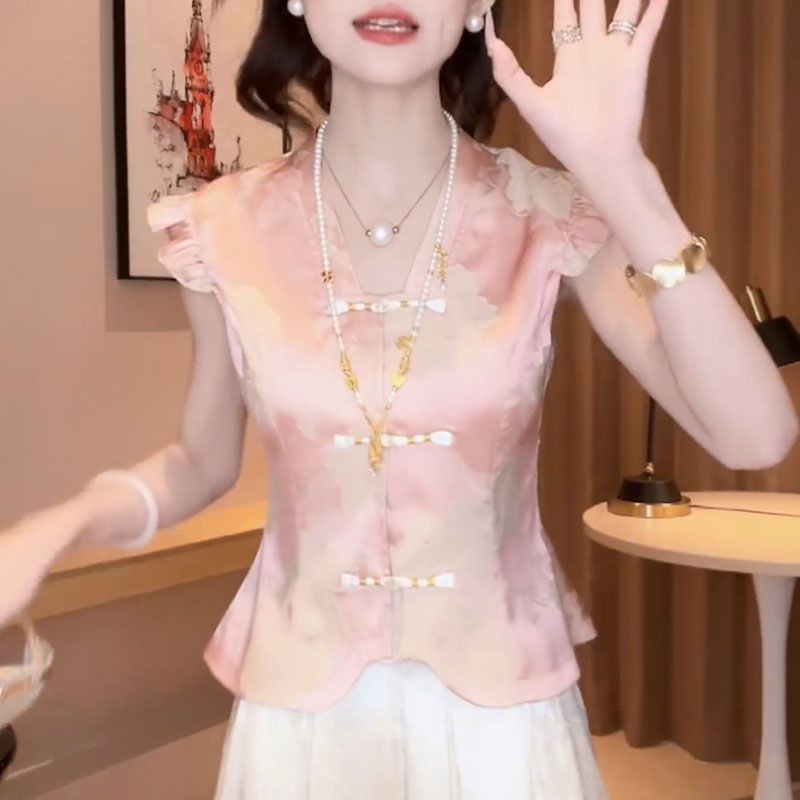 Atasan Cheongsam Gaya Cina Baru Berkualitas Tinggi yang Ditingkatkan Kemeja Satin Jacquard Asetat