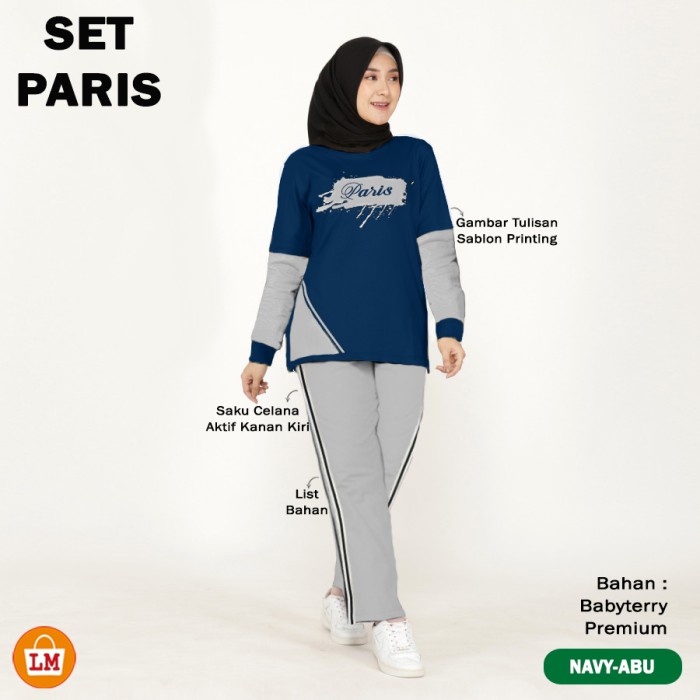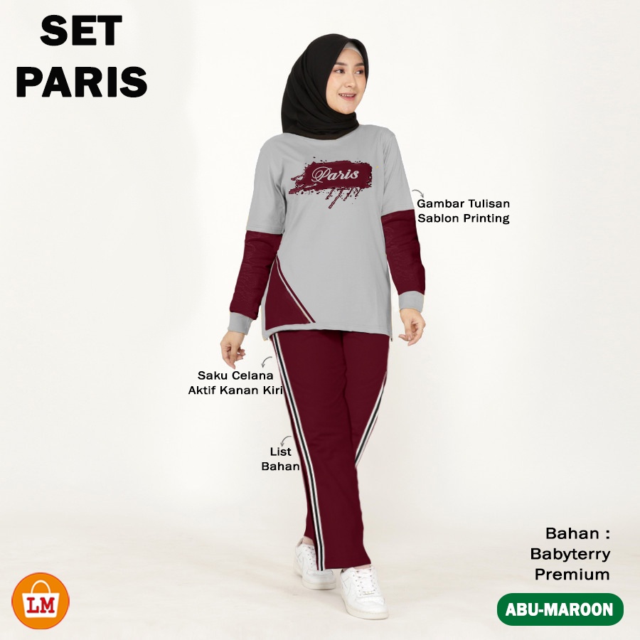 SET PARIS Setelan Training Olahraga Wanita Muslimah Kaos Babyterry Adem Lengan Panjang Sablon Size XL 2XL 3XL MANTUL 356
