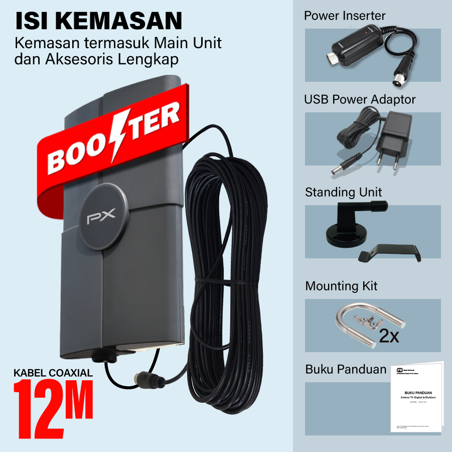 Antena TV Digital dan Analog Indoor/ door Booster + Kabel 12 Meter PX-DA 5120