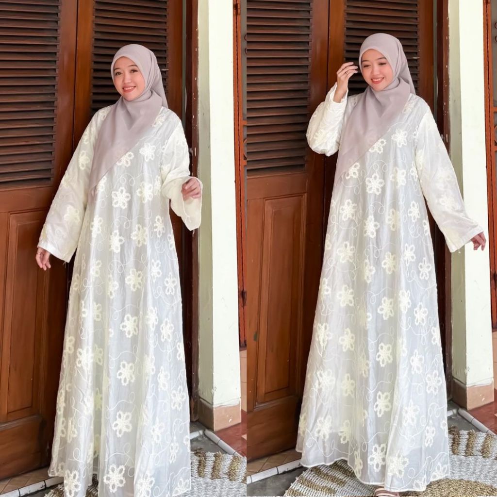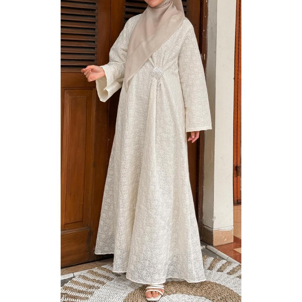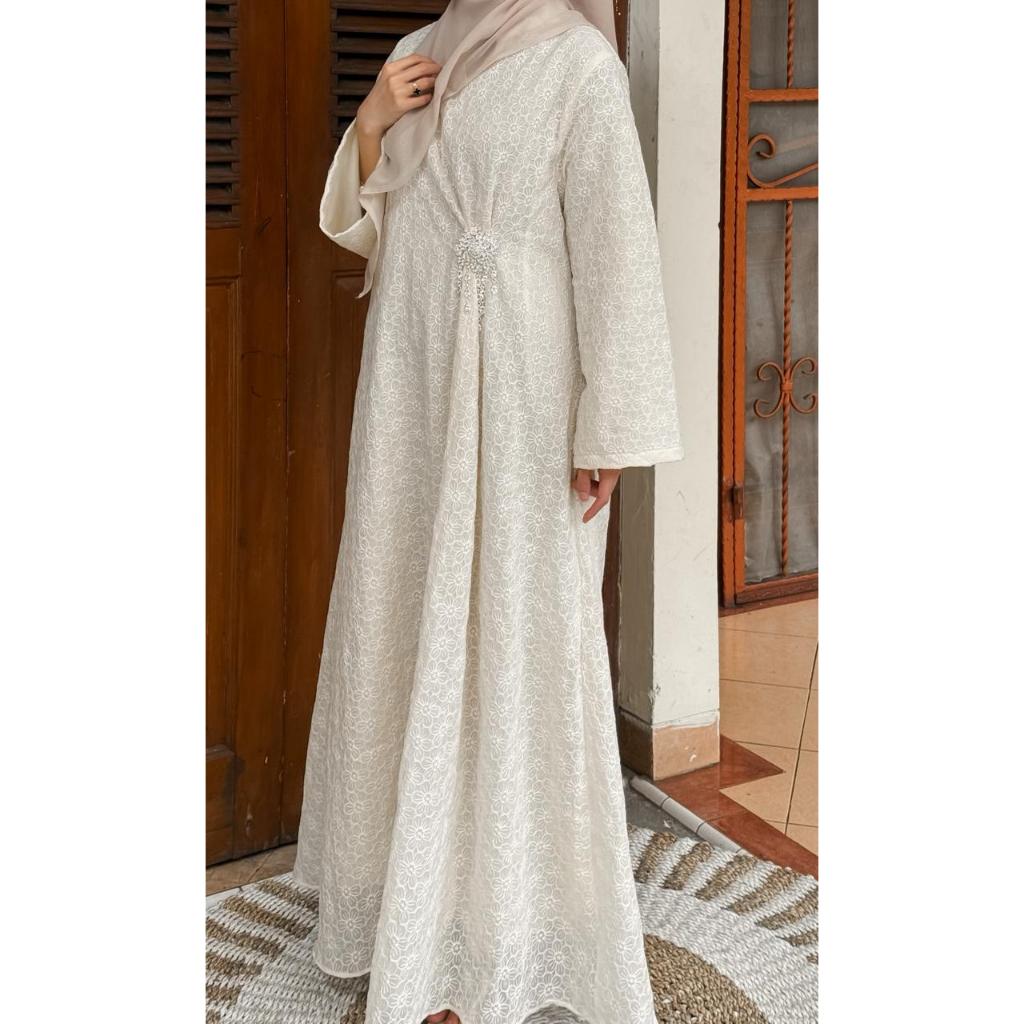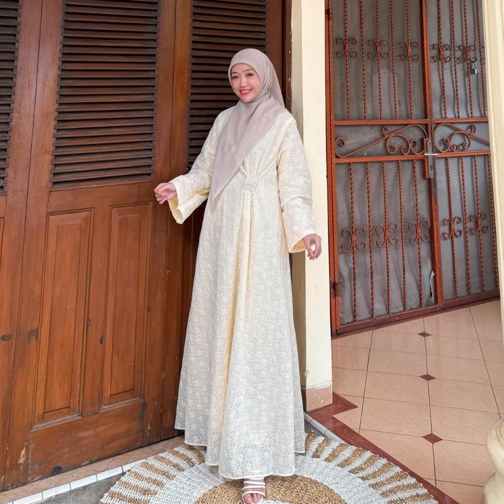 DP 0 Sherine Gamis Tancel Bordir Full Furing Abaya Outfit Raya 2026 Terbaru Lebaran Ivory Kondangan Baju Pesta Muslimah Dress Lembut Panjang