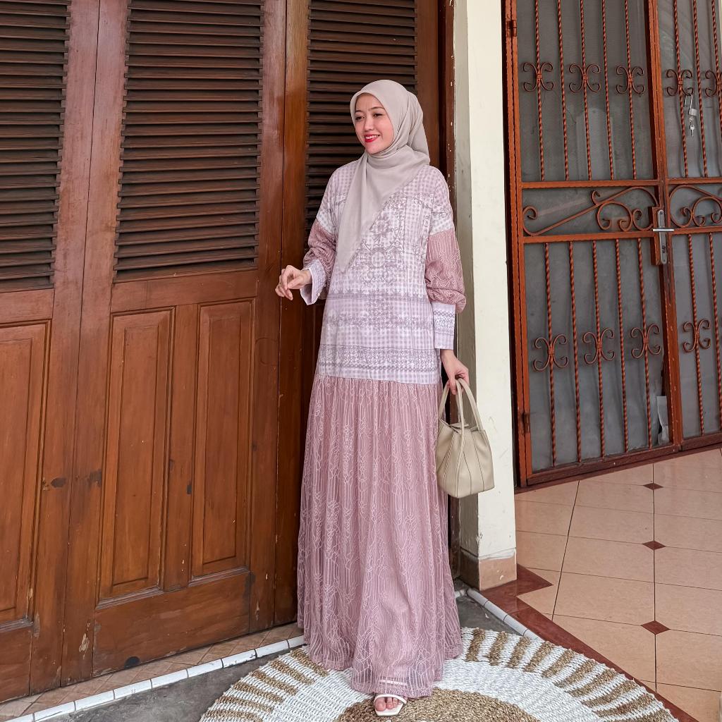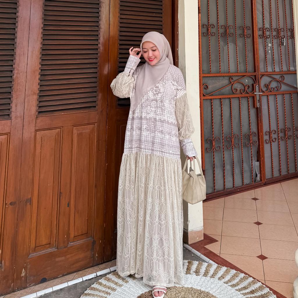 DP 0 Aghata Dress Otfit Kondangan Elegant Bridesmiad Lace Cantily Korean Printing Gamis Wanita Muslimah Baju Pesta Mewah Panjang Wudhu Maxii M