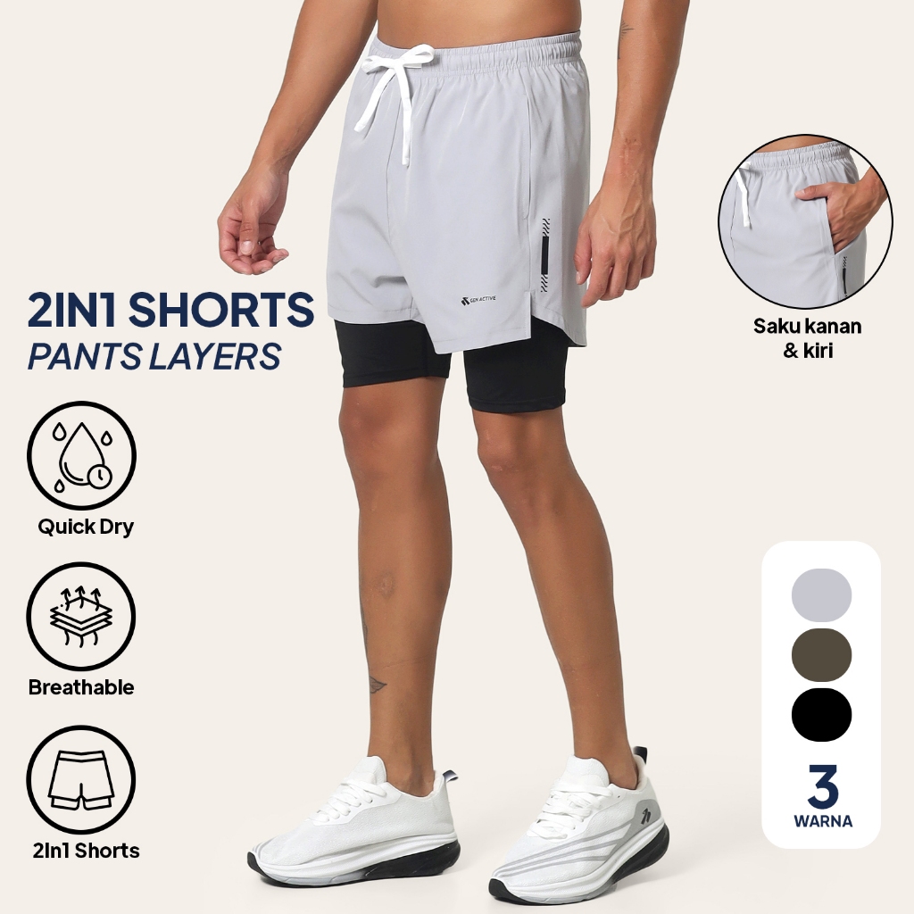 Gen Active Celana Short Olahraga Pria 2in1 Compression Baselayer Quick Dry Running Gym Padel Kasual