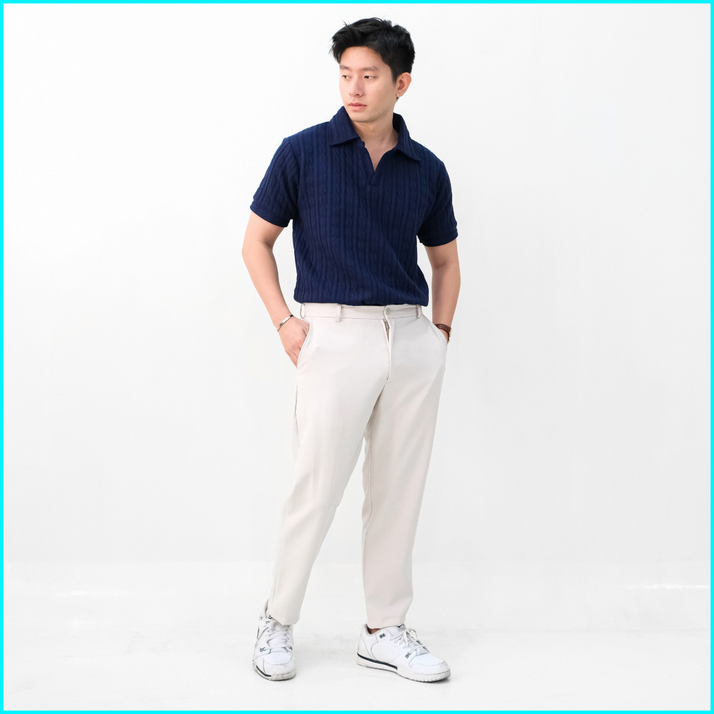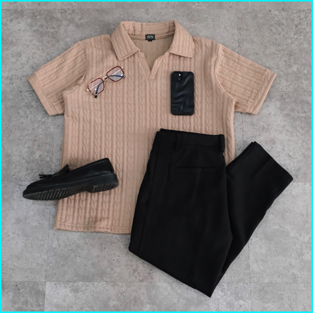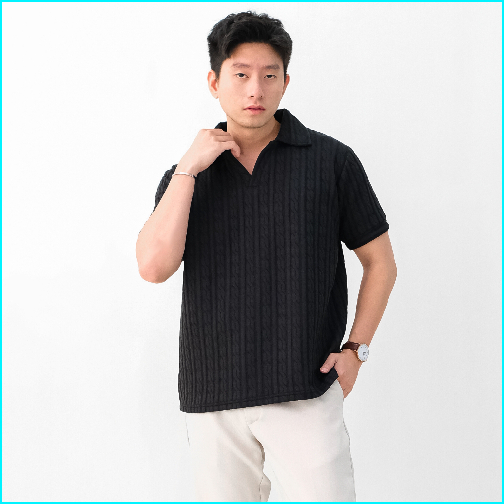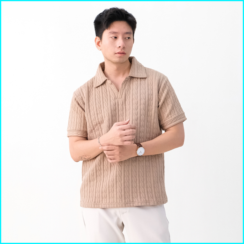 Sanvanina Cable Knit Polo Shirt Kemeja Polo Pria Lengan Pendek Rajut Atasan Berkerah Old Money