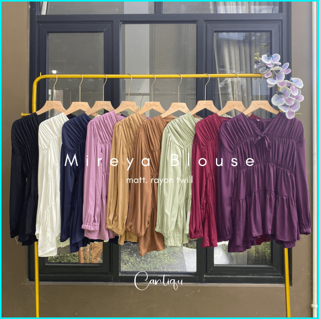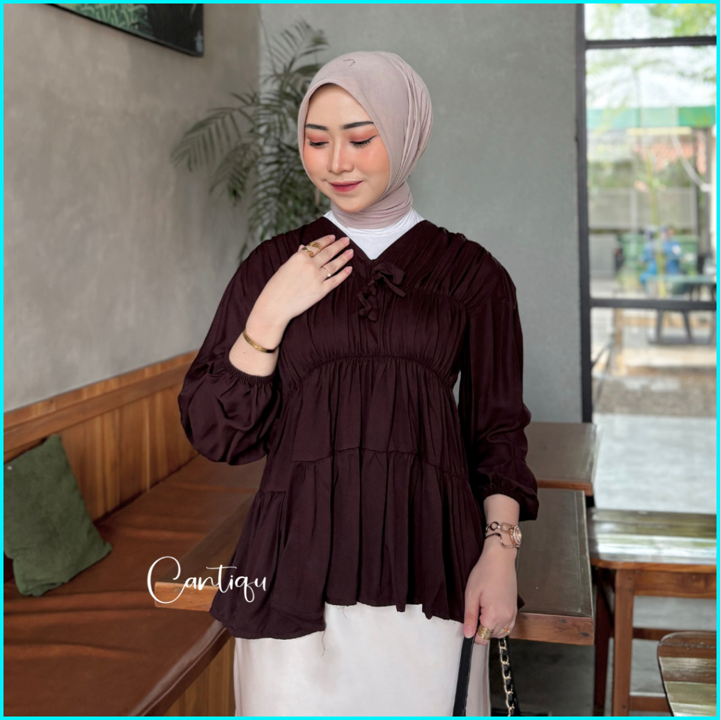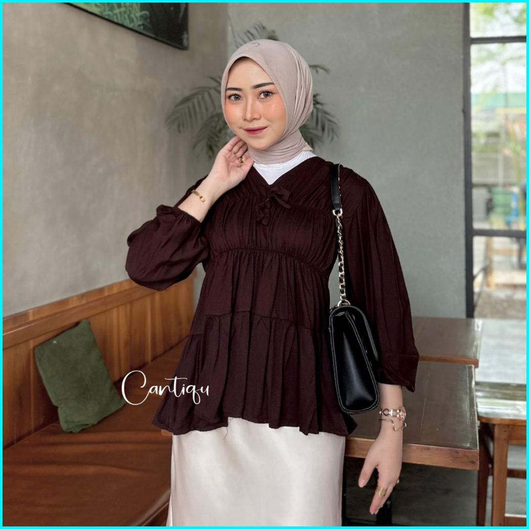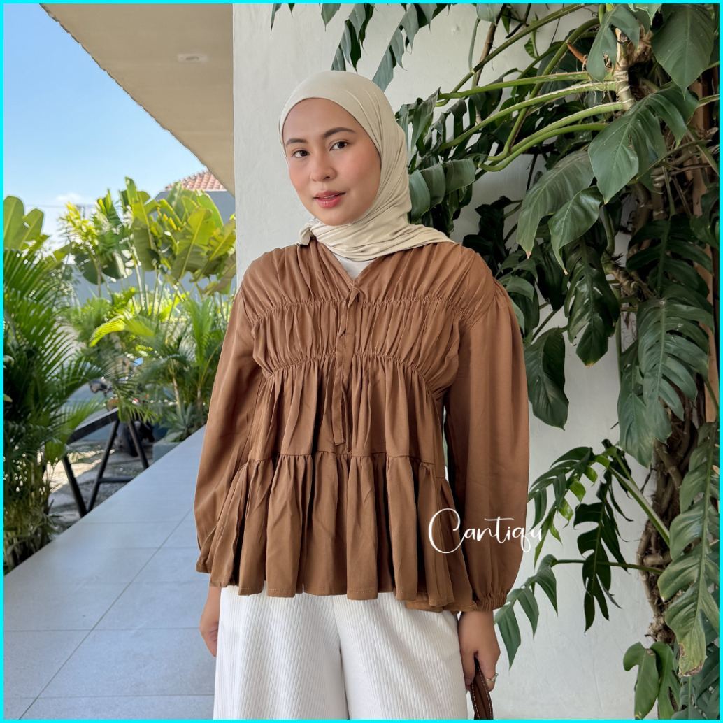 Cantiqu - Mireya Blouse Kerut Rayon Atasan Wanita Polos Warna Lengan Panjang