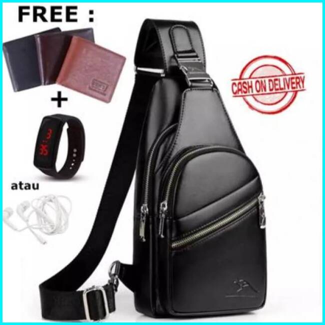 Tas Selempang Pria Kulit Murah Anti Air - Jason Bag Bonus Dompet Jam Tangan Led Headset