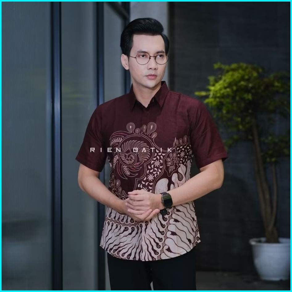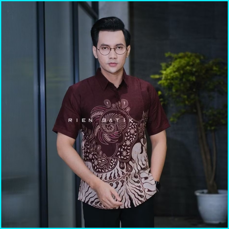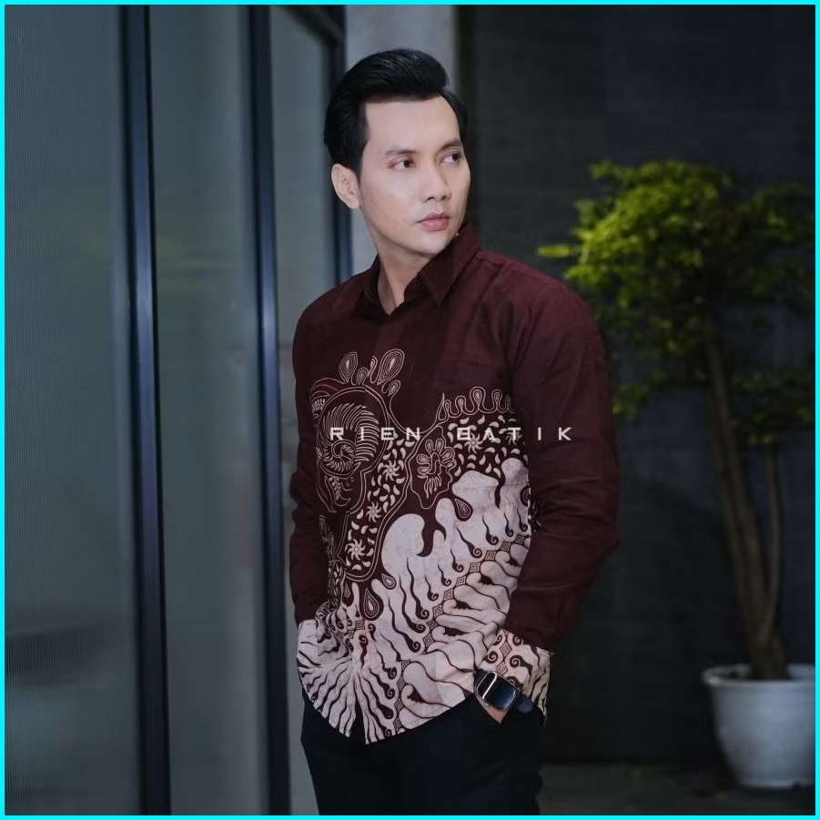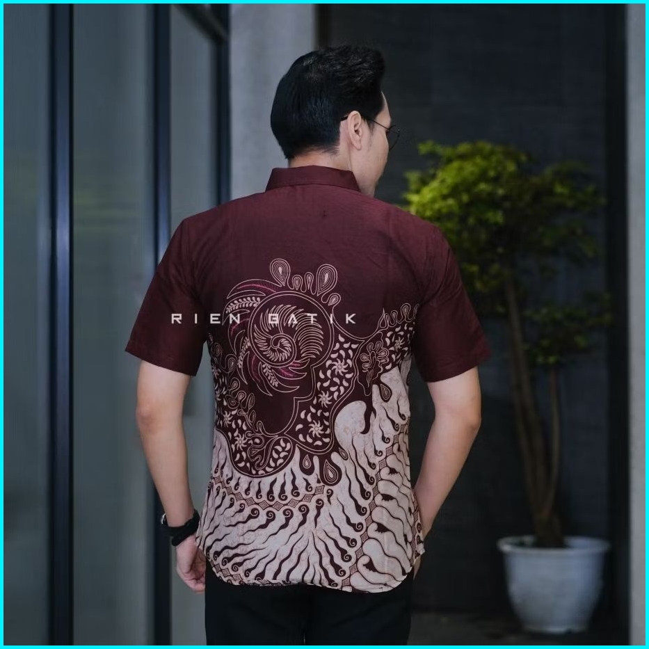 Kemeja Batik Slimfit Pria Warna Merah Maroon Burgundy Bahan Katun Lapis Furing Premium Motif Rien Batik Rangkong