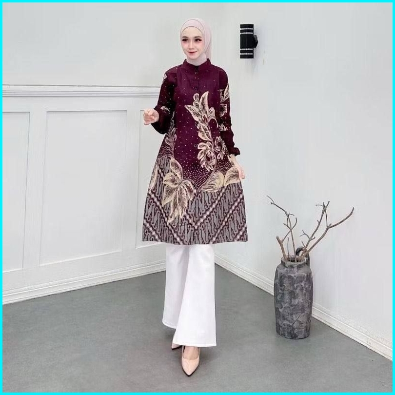 Batik Couple Suami Istri Tunik Batik Katun Jumbo Anggrek Atasan Wanita Batik Kerja Seragam Kantor Burgundy