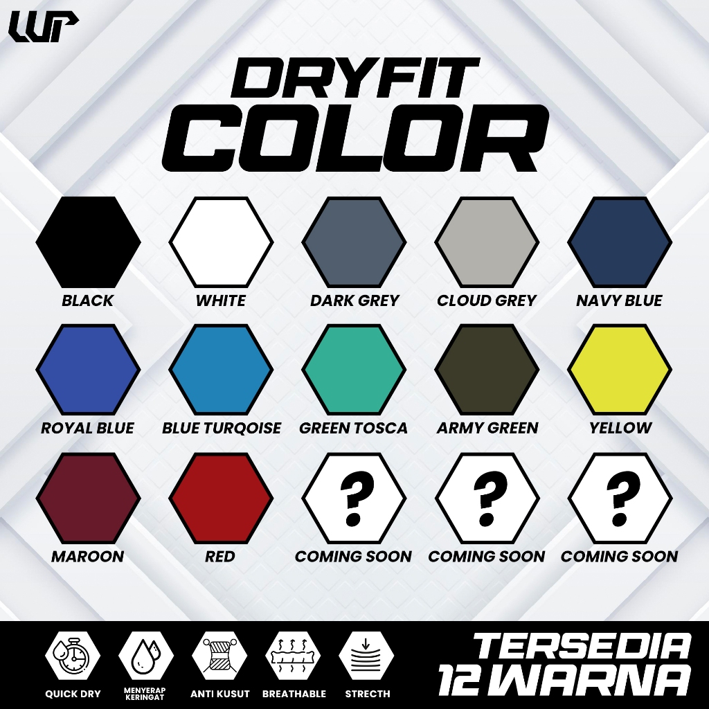 Black, White, Dark Grey, Cloud Grey, Navy Blue, Royal Blue, Maroon, Red, Blue Turqoise, Yellow, Green Tosca, Army Green