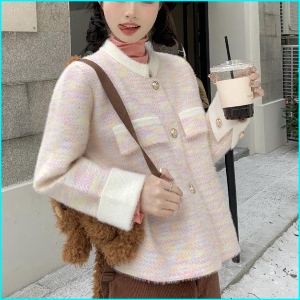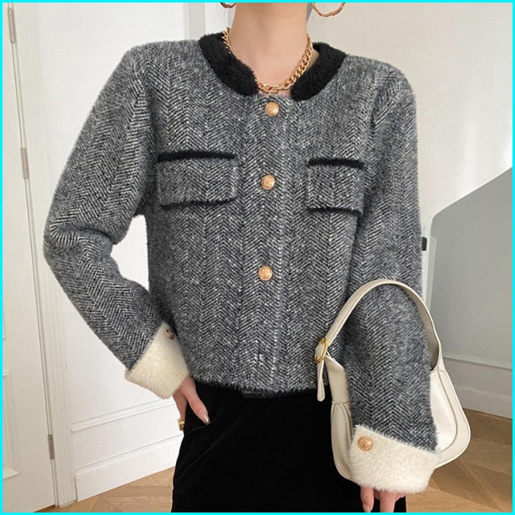 Monica Blazer Rajut Korean Polos Elegant Wol Santai Crew Neck Polos Hitam Lembut Salur