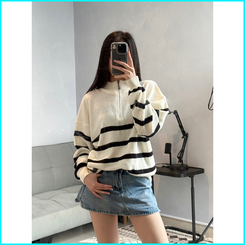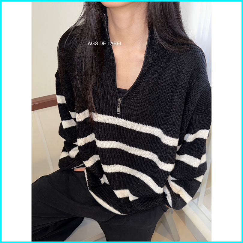 Ags Half-zip Striped Knit Berkerah Tinggi Nyaman