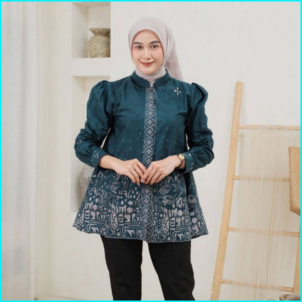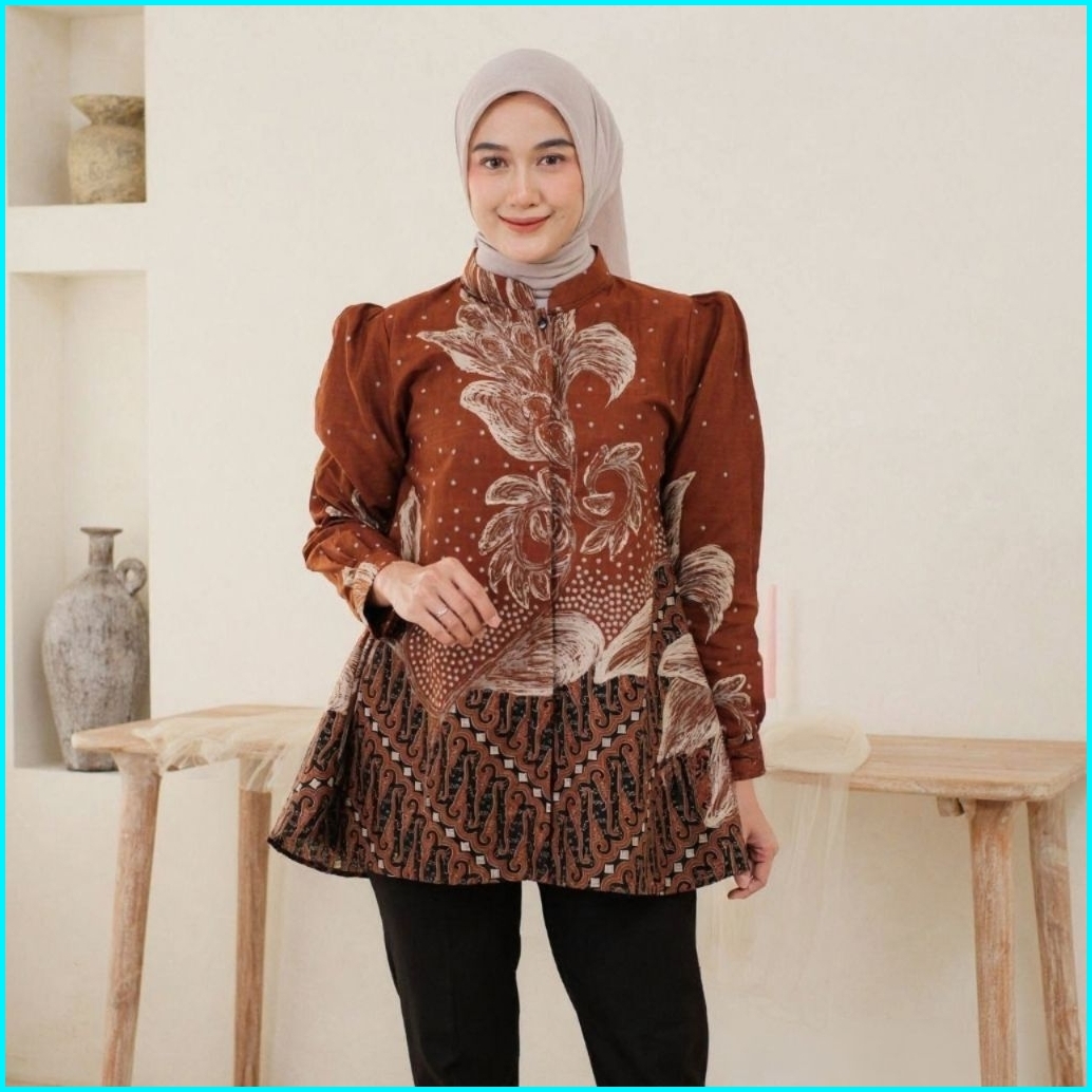 Blouse Batik Wanita Lengan Panjang Balon Burgundy Modern Baju Batik Atasan Batik Kerja Baju Batik Wanita