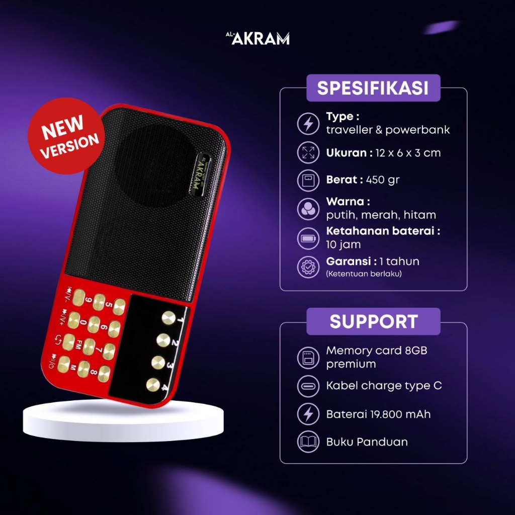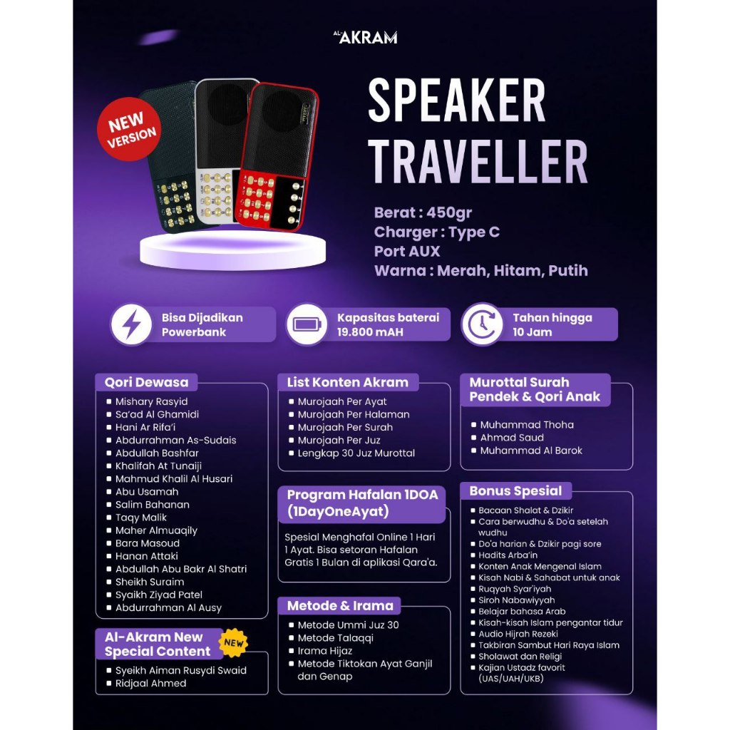 Speaker Murottal Al-Akram Traveller Versi Terbaru Charger Type C - Speaker Qur'An 30 Juz
