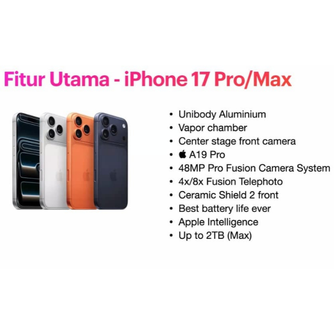iPhone 17 Pro Max [256GB] [512GB] Super Retina XDR OLED 6.9 inches - A19 Pro - 4823mAh [RESMI]