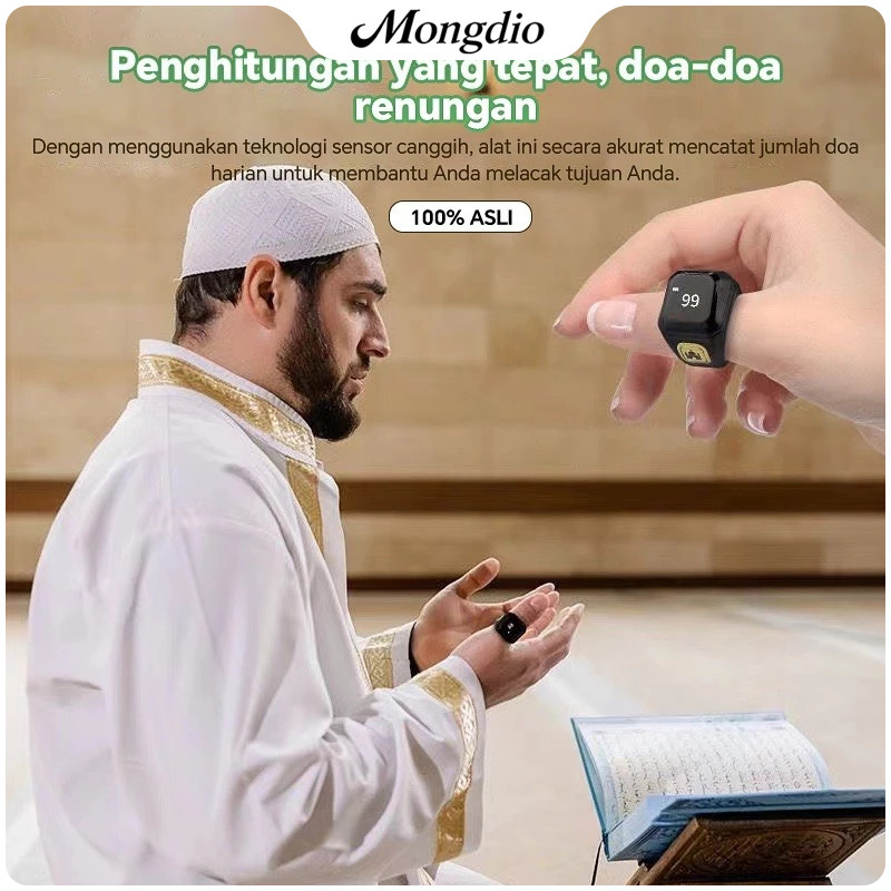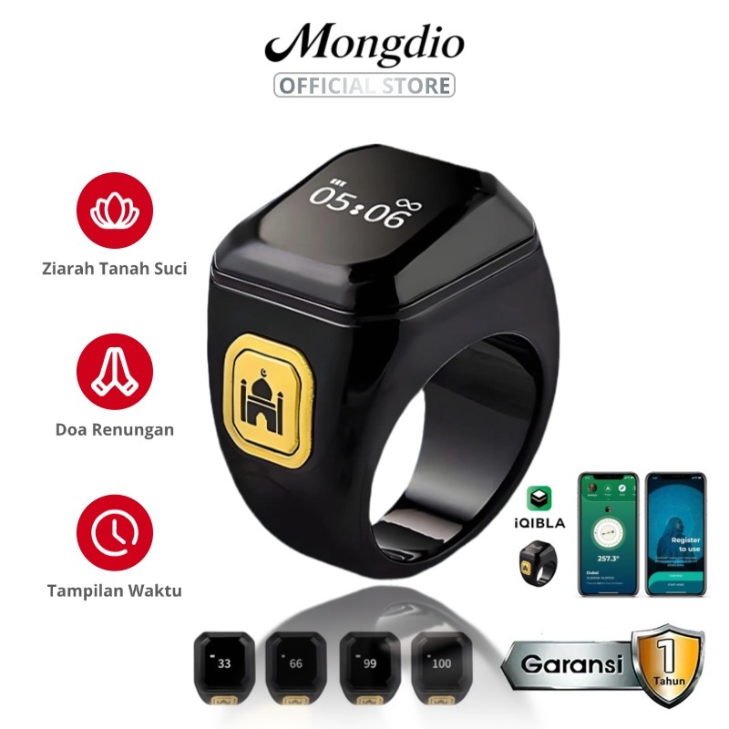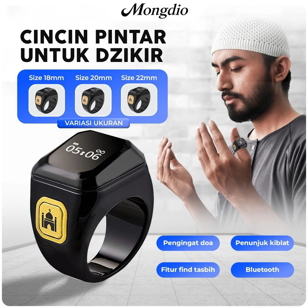 Mongdio Smart Ring Zikir Digital Cincin Tasbih Penghitung Doa & Penunjuk Arah Kiblat, Bluetooth, Tahan Air, Baterai Taha