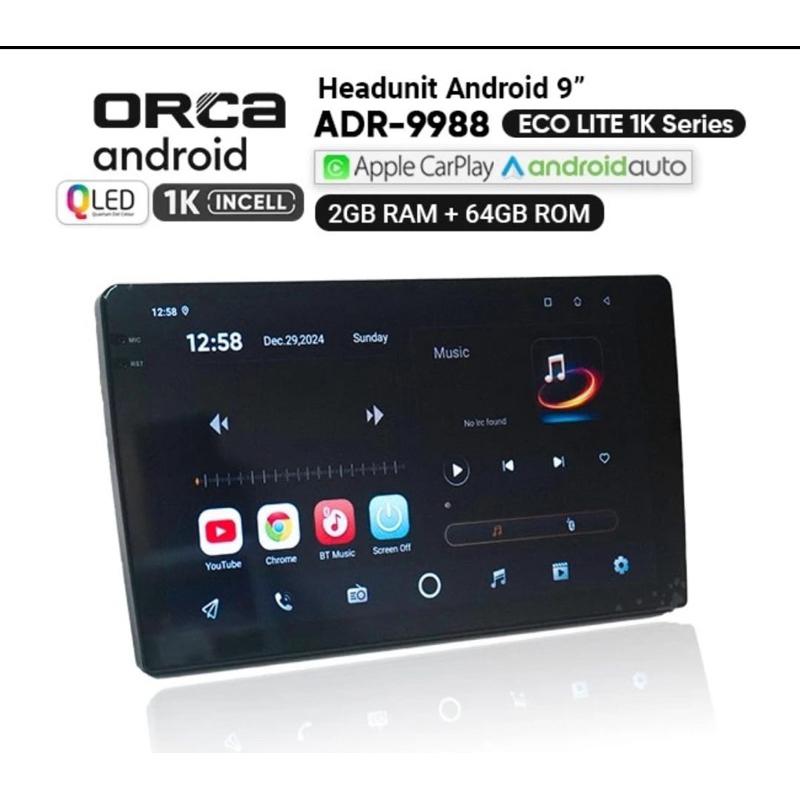 Head Unit Android Orca Adr-9988 9” / 10” Inch Ram 2+64GB 1K Eco Lite Series QLED Carplay & Android Auto