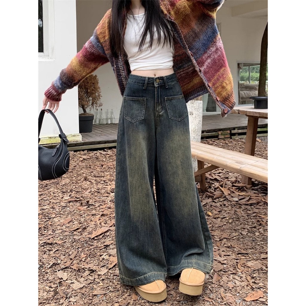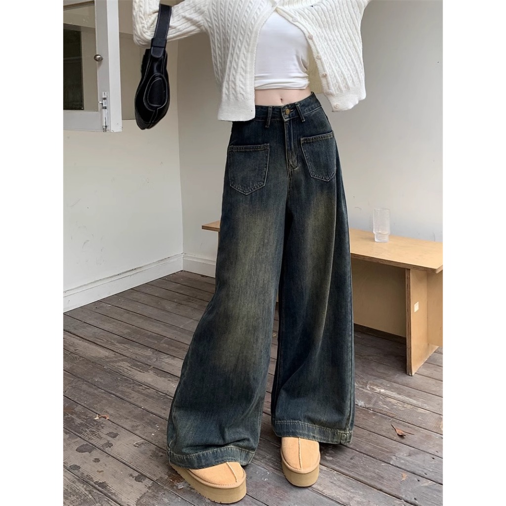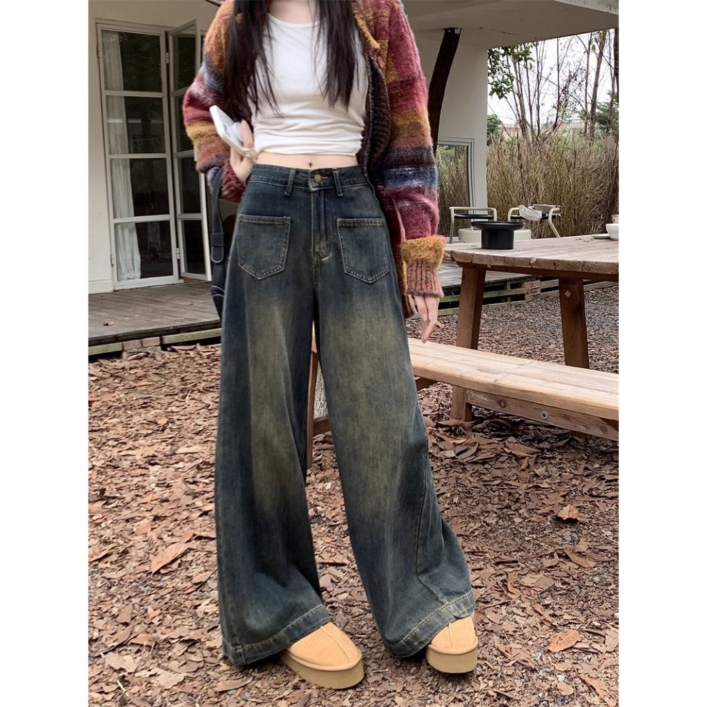 New Retro Biru High waist celana lebar kaki wanita korean style kulot loose jeans Celana cutbray wanita
