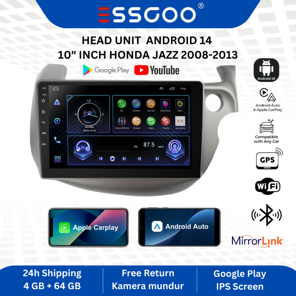 ESSGOO Head Unit 4G+64G Android 14 Untuk Honda Jazz 2008 - 2013 Termasuk Frame/PNP Soket 10 Inch