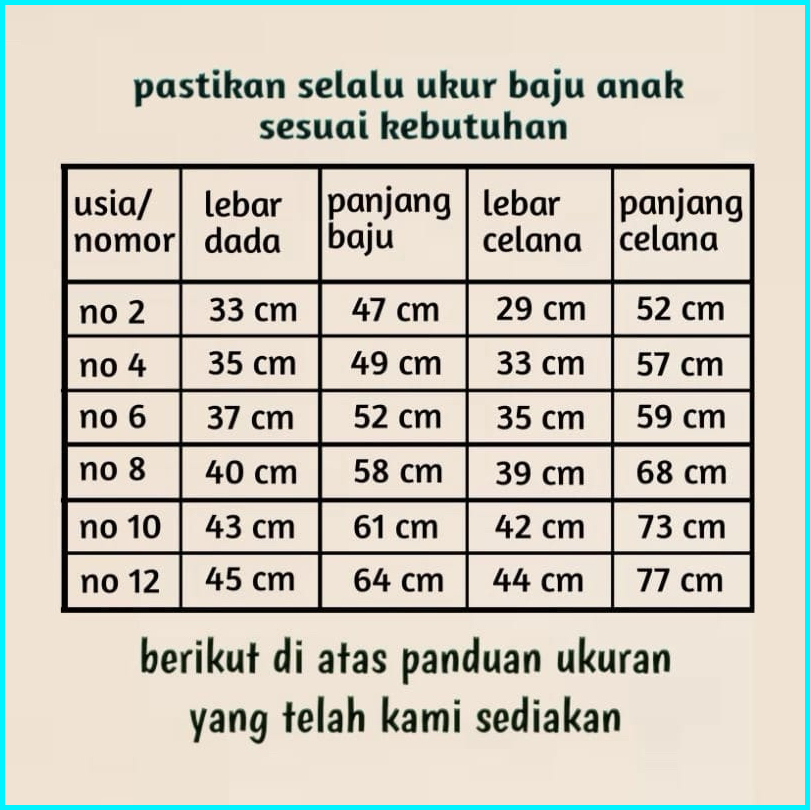 No 2 usi 1-2 tahun, No 4 usia 3-4 tahun, No 6 usia 5-6 tahun, No 8 usia 7-8 tahun, No 10 usia 9-10 thn, No 12 usia 11-12thun