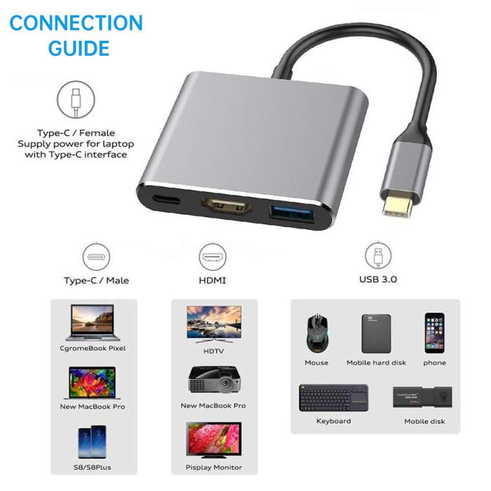 3 in 1 Konverter 4K HD USB 3.0 ke Type-C dengan Audio Video Female Transmisi Cepat Plug and Play Tanpa Driver - Abu-abu