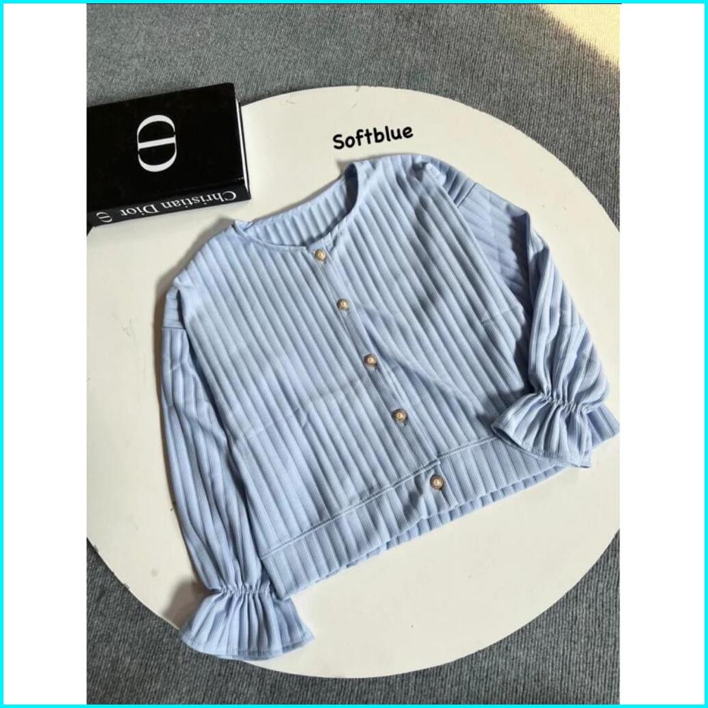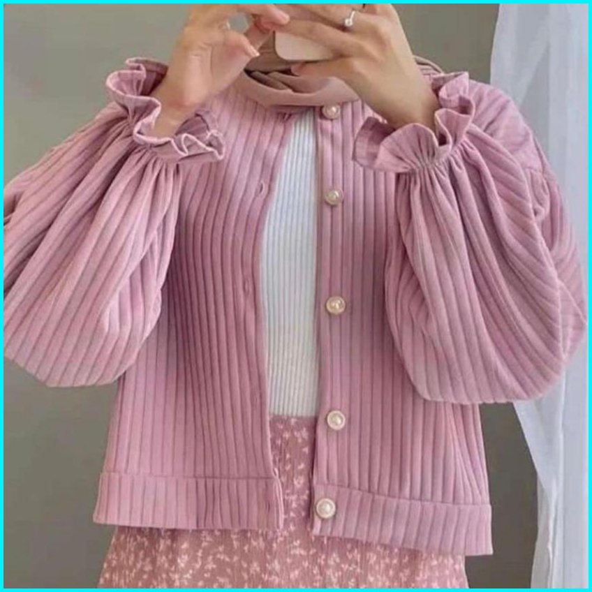 Cardigan Crop Top Hornet Kancing Lengan Panjang Kerut Balon Wanita Knit Kardigan