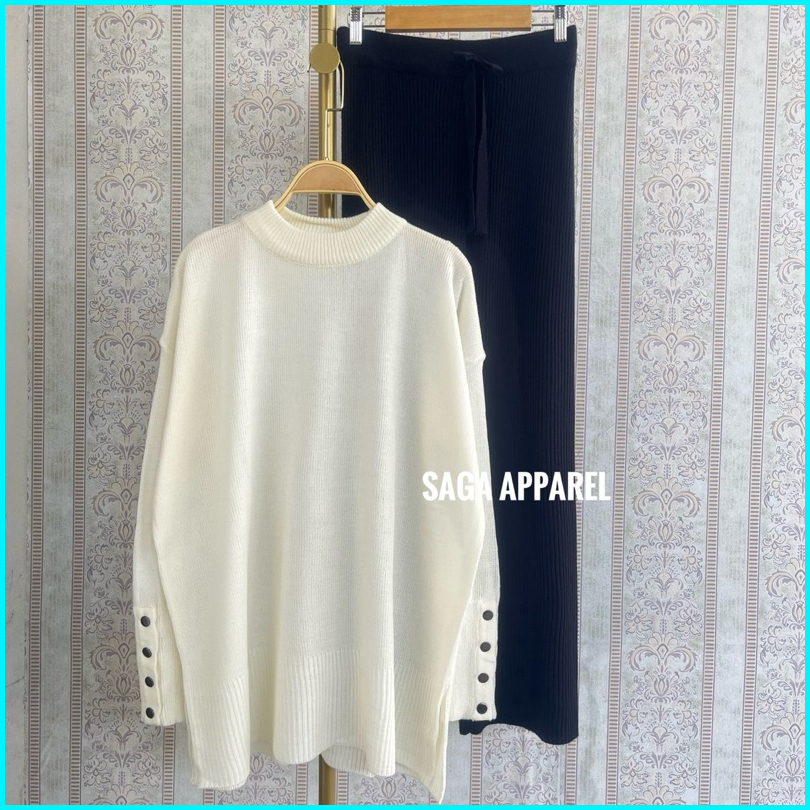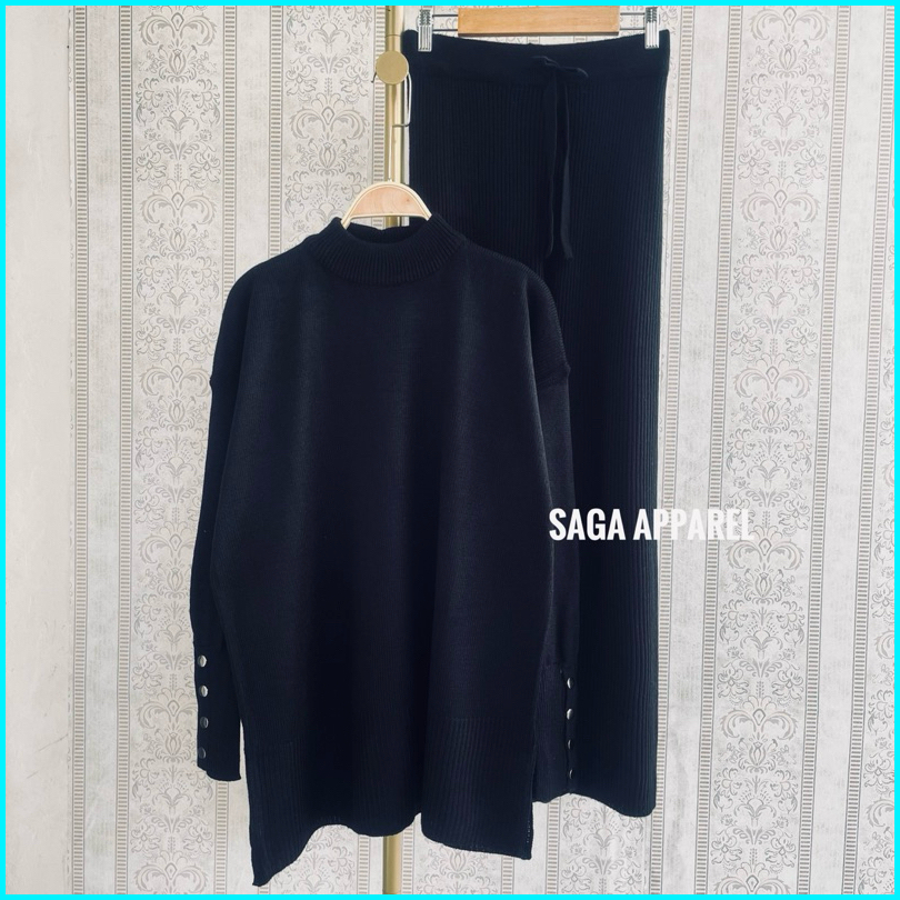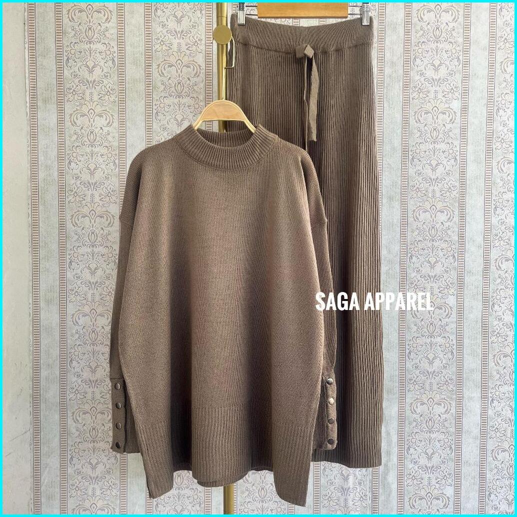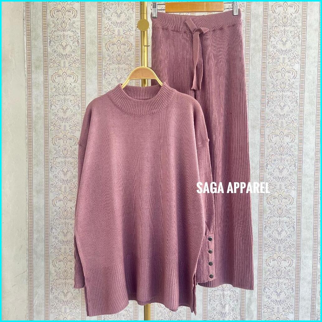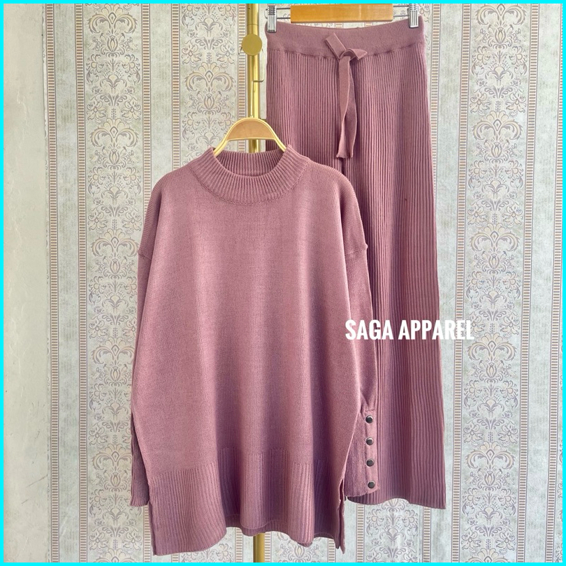 Delvi Oneset Blouse Rajut Tebal Motif Polos Kerah Bulat Lengan Panjang Variasi Kancing Setelan Celana Kulot