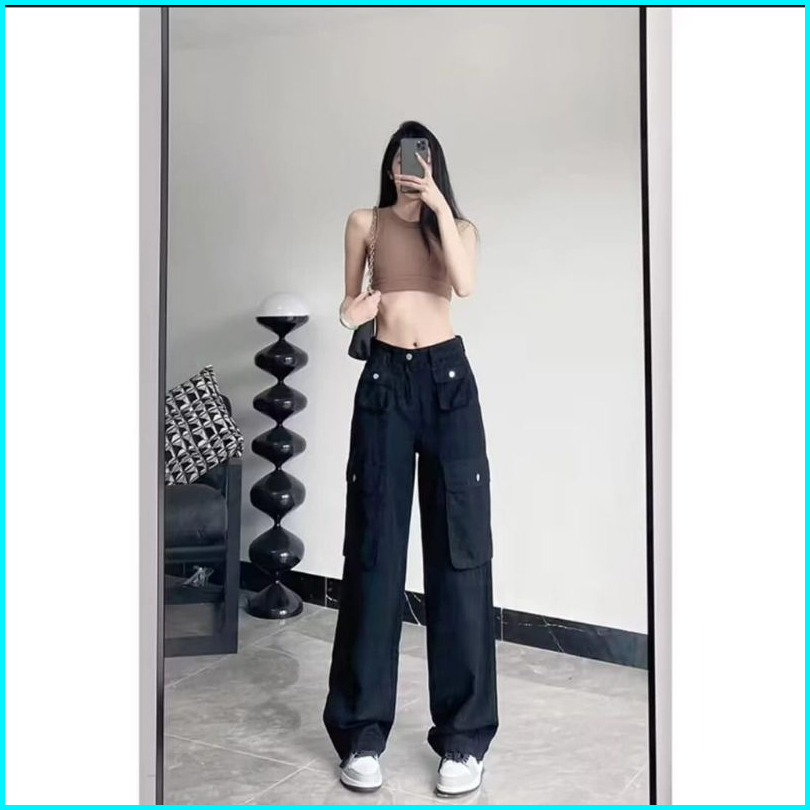 Ozy Store - Biru Retro Highwaist Celana Jeans Wanita Loose Kekinian